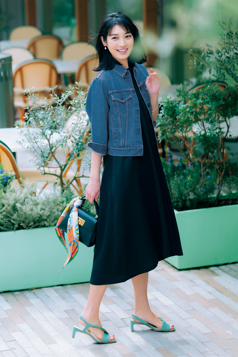 黒ワンピにカジュアル感をプラスするGジャンは男性からも人気のアイテム。モテ重視なら、トレンドのオーバーサイズよりもジャストなサイズ感のほうがバランスも良く見えて◎。Gジャン¥42,900(サンセ サンセ フォーRHC/RHC ロンハーマン)ワンピース¥19,800(アンクレイヴ スタンダード/オンワード樫山)バッグ¥66,000(FURLA/FURLA JAPAN)スカーフ¥13,200(マニプリ)サンダル¥16,500(ピシェアバハウス/ピシェアバハウス ルミネ有楽町店)ピアス¥23,100(ココシュニック)
