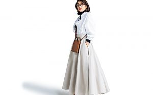 シャツ¥26,400(マルティニーク/マルティニーク ルコント ルミネ有楽町)ニット¥31,900(サンスペル/サンスペル 表参道店)スカート¥53,900(ebure/ebure GINZA SIX店)バッグ¥26,400(FURLA/FURLA JAPAN)シューズ¥15,400(ピシェ アバハウス/ピシェ アバハウスルミネ有楽町店)メガネ¥36,300(アイヴァン/アイヴァン 東京ギャラリー)ピアス¥7,350バングル¥9,450(ともにアビステ)