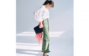 5月12日(木)、今季トレンドの「ベイカーパンツ」は、カーキを選ぶとカジュアルさが緩和され、キレイめコーデにしっくりハマります。フリルカラーの白ブラウスを合わせた、マニッシュ×フェミニンのテイストMIXで、こなれ感抜群の着こなしに。
