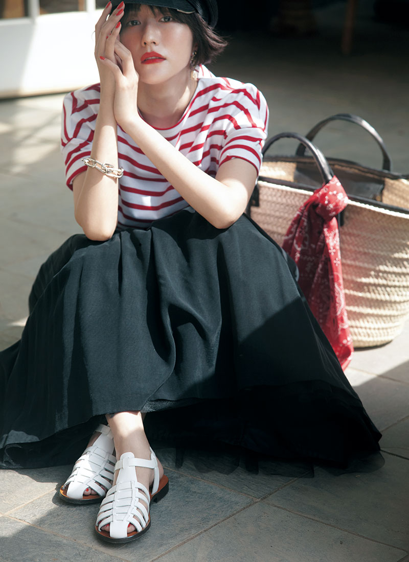 真っ白なグルカならカジュアルになりすぎず、ボーダーやかごバッグのラフなムードと相性抜群。シューズ¥17,000(CORSO ROMA.9/PLST)カットソー¥13,200(トラディショナル ウェザーウェア/トラディショナル ウェザーウェア ルミネ有楽町店)スカート[パニエ付き]¥42,900(ツル バイ マリコ オイカワ)キャスケット¥29,700(エントワフェイン)スカーフ¥13,200(マニプリ)イヤリング¥13,200(D.U.E/e.m.PRESS ROOM)ブレスレット¥165,000(e.m./e.m.青山店)かごバッグ¥24,200(ケッシュル エッセンシャル)