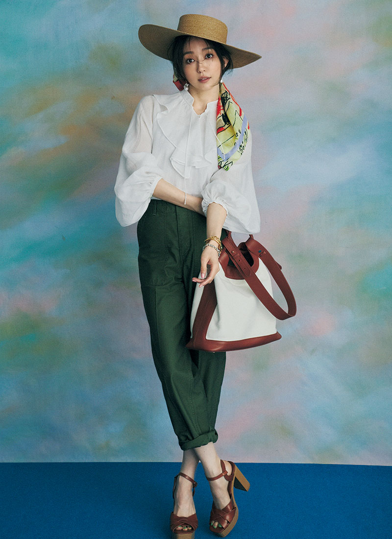 ブラウス¥25,300(マルティニーク/マルティニーク ルコント ルミネ有楽町)パンツ¥17,600(ユナイテッドアローズ/ユナイテッドアローズ有楽町店)バッグ¥64,900(エレメ/アマン)サンダル¥11,990(ザラ/ザラ カスタマーサービス)帽子(スカーフ付き)¥23,100(マニプリ)スカーフ¥19,800(マックス アンド コー/マックスマーラ ジャパン)ピアス¥23,650〈インツーデザイン〉バングル¥16,390〈ソコ〉ゴールドチェーンブレスレット¥26,290〈ベンアムン〉(すべてZUTTOHOLIC)シルバーブレスレット¥18,900(アビステ)