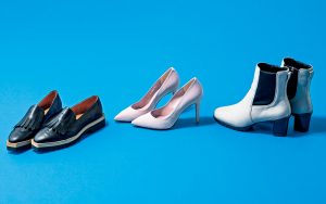 右から/ブロックヒール&ゴム底で濡れた地面でも滑りにくい。ライトグレーで軽やかに。ブーツ¥17,490(fitfit®/fitfit®店舗カスタマーサービスセンター)撥水素材でオールウェザー対応。縫い目には防水テープも施されているので雨染みの心配も少なめ。パンプス¥14,300(ダイアナ/ダイアナ銀座本店)撥水&ゴム底の頼もしいローファー。厚底ソールにタッセルなどデザインにも妥協がなく、晴れていても履きたくなる一足。ローファー¥25,300(銀座かねまつ/銀座かねまつ6丁目本店)