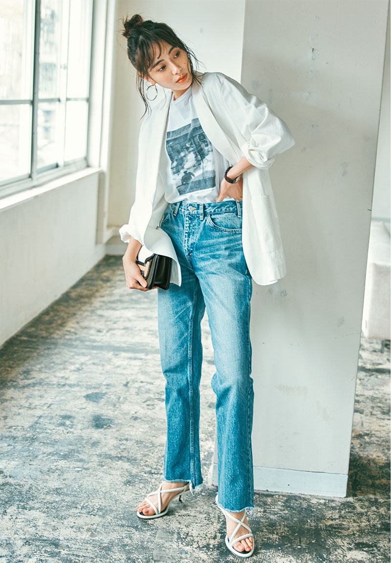リネンのジャケットもベージュではなく白というチョイスが今年らしい。Tシャツのモノクロフォトと相まってシュッとハンサムな女っぽさが滲み出て。Tシャツ¥9,900(マルティニーク/マルティニーク ルコント ルミネ有楽町)デニムパンツ¥29,700(アンスクリア/アマン)ジャケット¥44,000(トラディショナル ウェザーウェア/トラディショナル ウェザーウェア ルミネ有楽町店)バッグ¥111,100サンダル¥135,300(ともにピエール アルディ/ピエール アルディ東京)ピアス¥8,400(アビステ)バングル¥66,000(レフィエ/フラッパーズ)