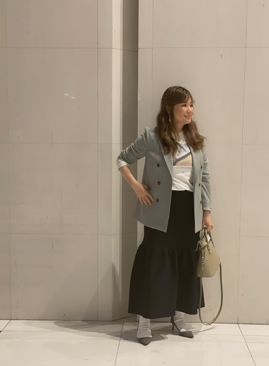 「引き締め効果抜群の黒スカートは、ぽっちゃり体型に欠かせないアイテム。THREE SQUARE×スタイリスト乾さんのコラボのニットスカートはティアードのデザインに一目惚れして即、ポチりました!トップスは白ベースTシャツに春らしい明るいくすみグリーンのジャケットをON。ファミマの白ソックスで足元にも明るさを加えました」(ライター 佐藤かな子さん)