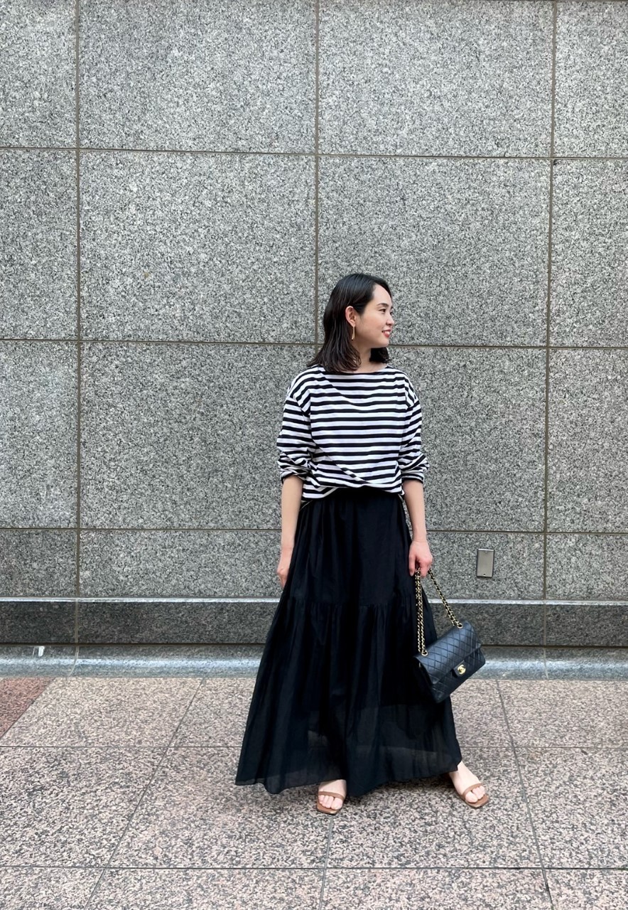 「黒のロングスカートは揺れ感のあるソフトな素材のものを選ぶと、重く見えず春らしく着られます。ボートネックのカットソーで抜け感を出しつつ、レザーのチェーンバッグできりっとメリハリを効かせました。足元はベージュのフラットサンダルで優しげにまとめました」(スタイリスト 大島 愛さん)