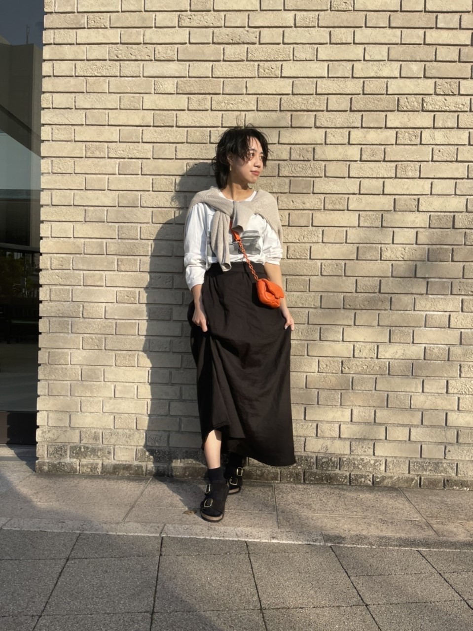 「リネン素材のブラックスカートは、肌触りが良く涼しく着られるので春夏に活躍!鮮やかなオレンジのミニバッグを差し色にプラスしました。ニットを肩掛けすることで目線が上がり、黒スカートのコーデが軽やかに仕上がります」(スタイリスト 村瀬萌子さん)