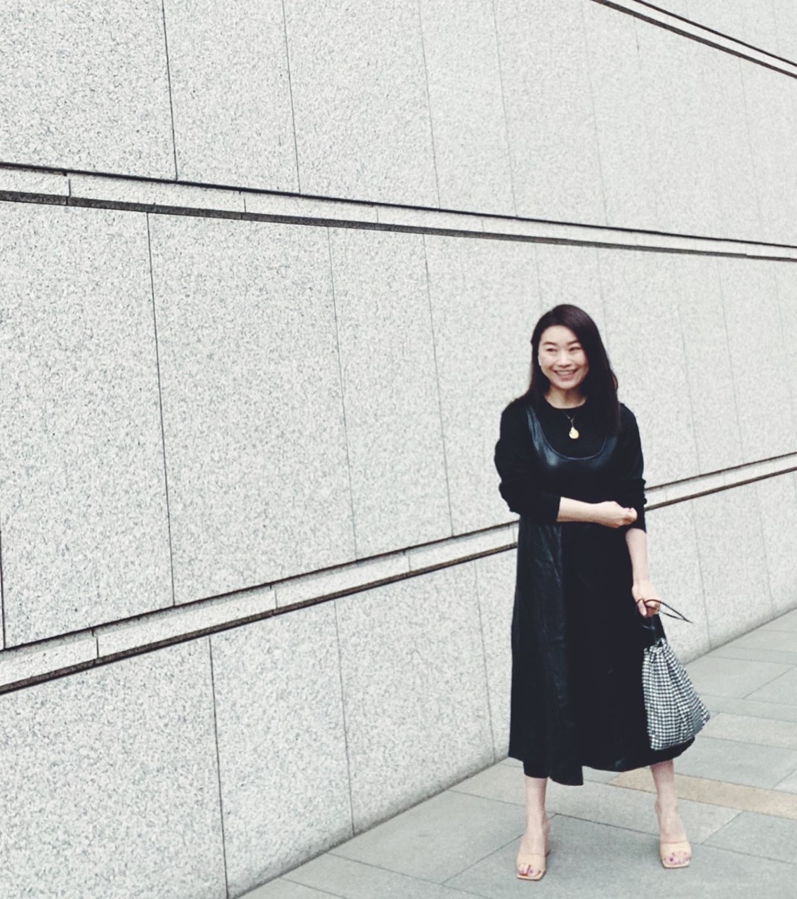 「暖かいけど、夜は微妙に寒いという、夏までのこの時期。袖を腕まくりして温度調整できるSLONEの黒ロンTが大活躍!同じ色のレザーワンピと合わせて、黒のレイヤードスタイルを楽しんでいます。サンダルの色を肌とつないで素足感を強調し、初夏っぽく♡」(ライター 棚田トモコさん)