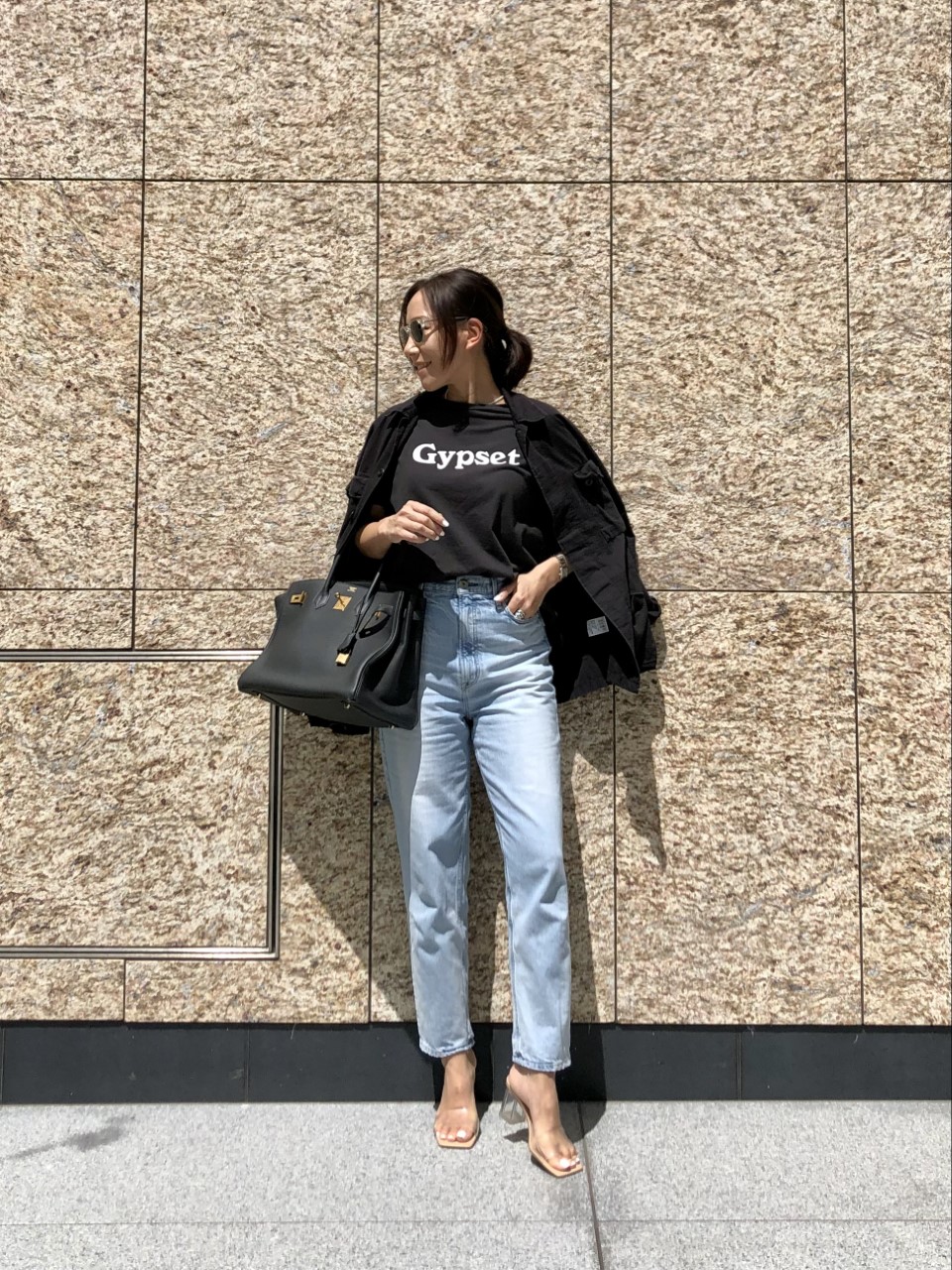 「去年ゲットしたTシャツは〝真っ黒〟ではなくニュアンスのある〝墨黒〟なところが気に行って購入。真っ黒より顔立ちも優しく見える気がします。黒Tシャツには薄めの水色デニムが好相性!バルーンレッグが今年らしいアッパーハイツの〝THE MISS〟を合わせることが多いです」(ライター 塚本桃子さん)