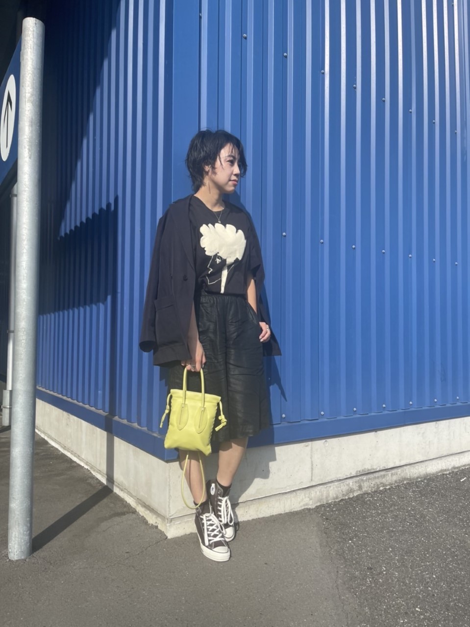 「AKIRA NAKAの黒Tシャツに同色のバミューダパンツを合わせて、抜け感のあるワントーンコーデに。脚を出すことで全身黒でも重く見えず、ヘルシーに着られる気がします。黒アイテムは少し光沢のある素材を選ぶと、平坦な印象にならず清涼感もアップします」(スタイリスト 村瀬萌子さん)