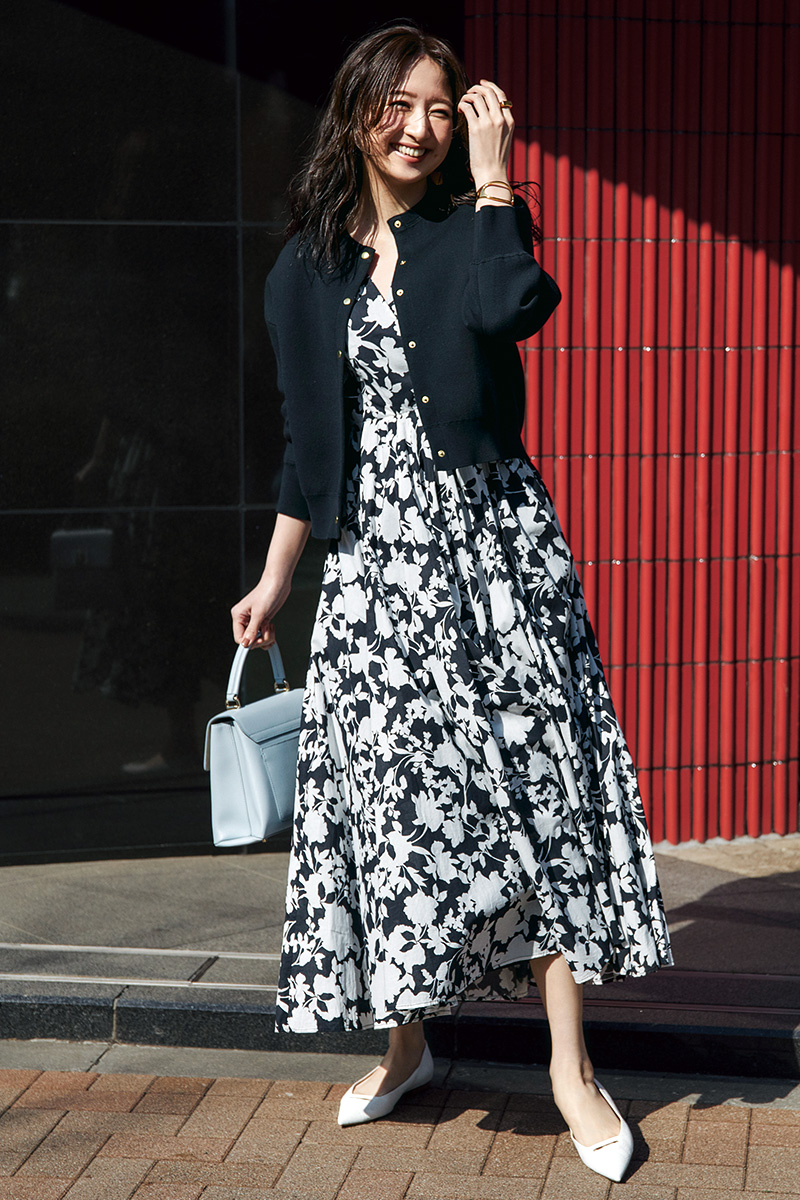 ドラマチックなフラワープリントとたっぷりのボリューム感にときめくロングワンピースは、モノトーンならオフィスでもトゥーマッチになりません。ポイントはカーディガンを羽織って全体的に黒の面積を増やすことで、より引き締まった印象に。デートがなくても、自分のモチベーションを上げるために着るのだって大賛成♡ワンピース¥35,200(マリハ)カーディガン¥20,900(ユナイテッドアローズ/ユナイテッドアローズ有楽町店)バッグ¥71,500(フルラ/フルラ銀座店)パンプス¥52,800(ペリーコ/アマン)バングル¥18,480リング2本セット¥21,230(ともにソコ/ZUTTOHOLIC)