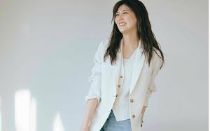 ジャケット¥31,900ベスト¥19,800(ともにツル バイ マリコ オイカワ)タンクトップ¥8,250(ティッカ/アッシュプラスエリオトロープ)デニムパンツ¥24,750(SERGE de bleu/ショールーム セッション)バッグ¥26,400(シィメ/ヤマニ)パンプス¥29,700(銀座かねまつ/銀座かねまつ6丁目本店)ピアス¥11,550(サラ/ココシュニック オンキッチュ 有楽町マルイ店)バングル¥11,550(エイチアッシュ/フォーティーン ショールーム)リング¥52,800(マリハ)