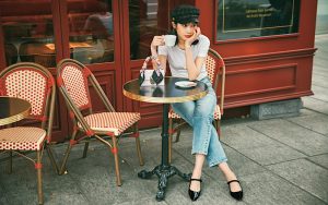 Tシャツ¥8,250(スリードッツ/スリードッツ青山店)デニムパンツ¥47,300(マディソンブルー)バッグ¥216,700(クリスチャンルブタン/クリスチャンルブタンジャパン)シューズ¥118,800(マノロブラニク/ブルーベル・ジャパン)キャスケット¥20,900(マックス アンド コー/マックスマーラ ジャパン)ピアス¥146,300パールネックレス¥41,800コインネックレス¥302,500ブレスレットにしたネックレス¥74,800(すべてマリハ)