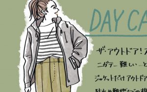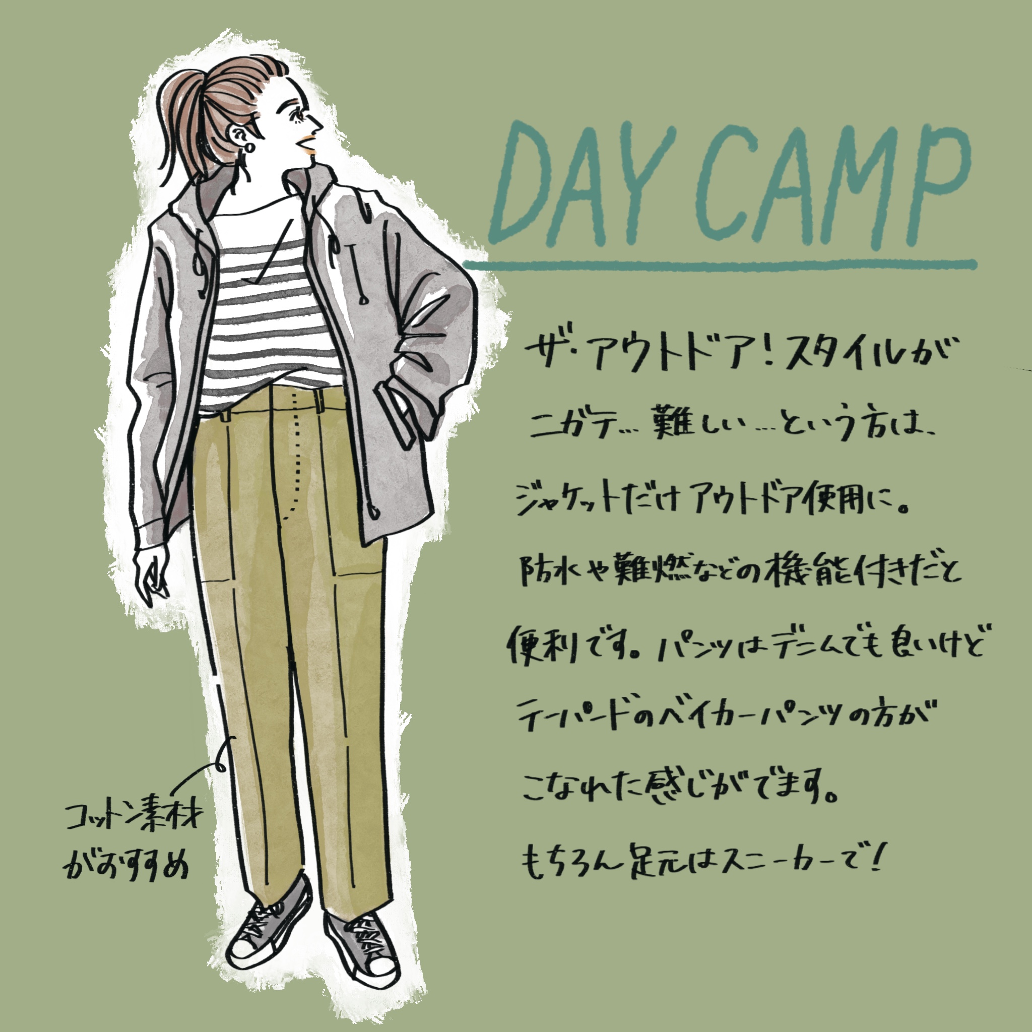 だんだんお出かけや旅行も解禁になってきたけれど、やっぱり安心して人と集まって遊べるのは屋外!空前のアウトドアブームですが、いざ誘われたとき「何着て行こう!?」と迷ってしまった経験はありませんか?カジュアルすぎると子供っぽいし、キレイめすぎると場違いだし…そのさじ加減が難しい!そこで自身もアウトドア好きなCLASSY.スタイリストの栗尾が、直筆イラストで”大人のアウトドアコーデ”を分かりやすく解説。場になじんでちゃんとオシャレ感もあるコーデを提案します。第一回は「デイキャンプ」の日のコーデです。