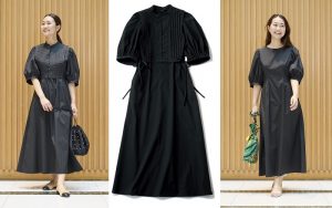 大きく膨らませた袖は肘下まであるので、キチンとした席でも着られるデザイン。ウエストのダーツとコンパクトな上半身、広がる裾のバランスでスタイルアップ効果も。着回し力まで考えられた2WAYワンピは大人っぽく&シーンレスに着られる黒を別注。洗えてシワになりにくい素材でこれからの季節にも最適です。【購入はこちらから】