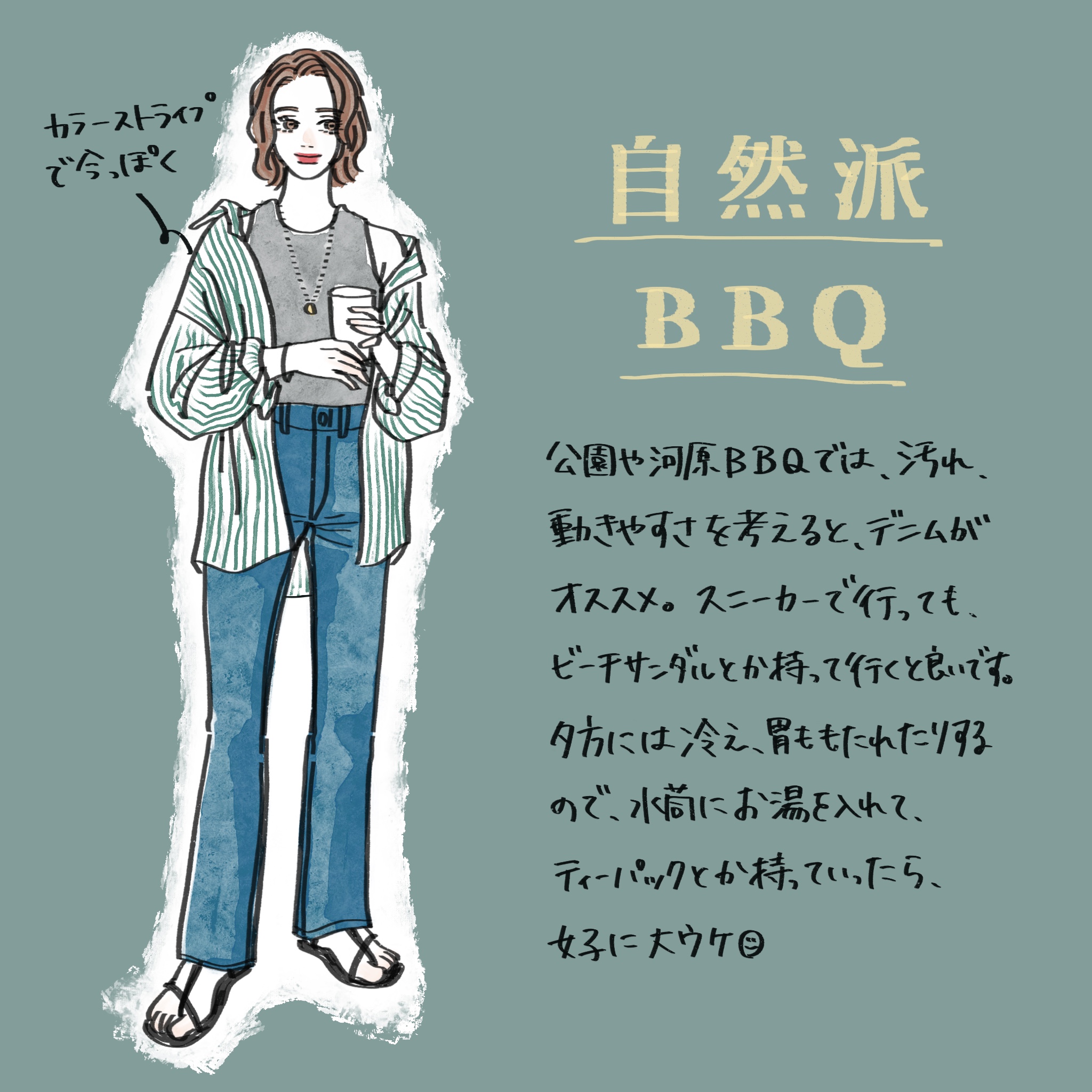 「公園や河原BBQでは、汚れ、動きやすさを考えると、デニムがオススメ。スニーカーで行っても、ビーチサンダルとか持っていくと良いです。夕方には冷え、胃ももたれたりするので、水筒にお湯を入れてティーパックとか持っていったら、女子に大ウケ!」by.Kurio