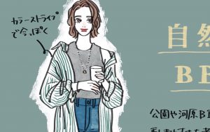 だんだんお出かけや旅行も解禁になってきたけれど、やっぱり安心して人と集まって遊べるのは屋外!空前のアウトドアブームですが、いざ誘われたとき「何着て行こう!?」と迷ってしまった経験はありませんか?カジュアルすぎると子供っぽいし、キレイめすぎると場違いだし…そのさじ加減が難しい!そこで自身もアウトドア好きなCLASSY.スタイリストの栗尾が、直筆イラストで”大人のアウトドアコーデ”を分かりやすく解説。場になじんでちゃんとオシャレ感もあるコーデを提案します。第二回は「自然派BBQ」の日のコーデです。