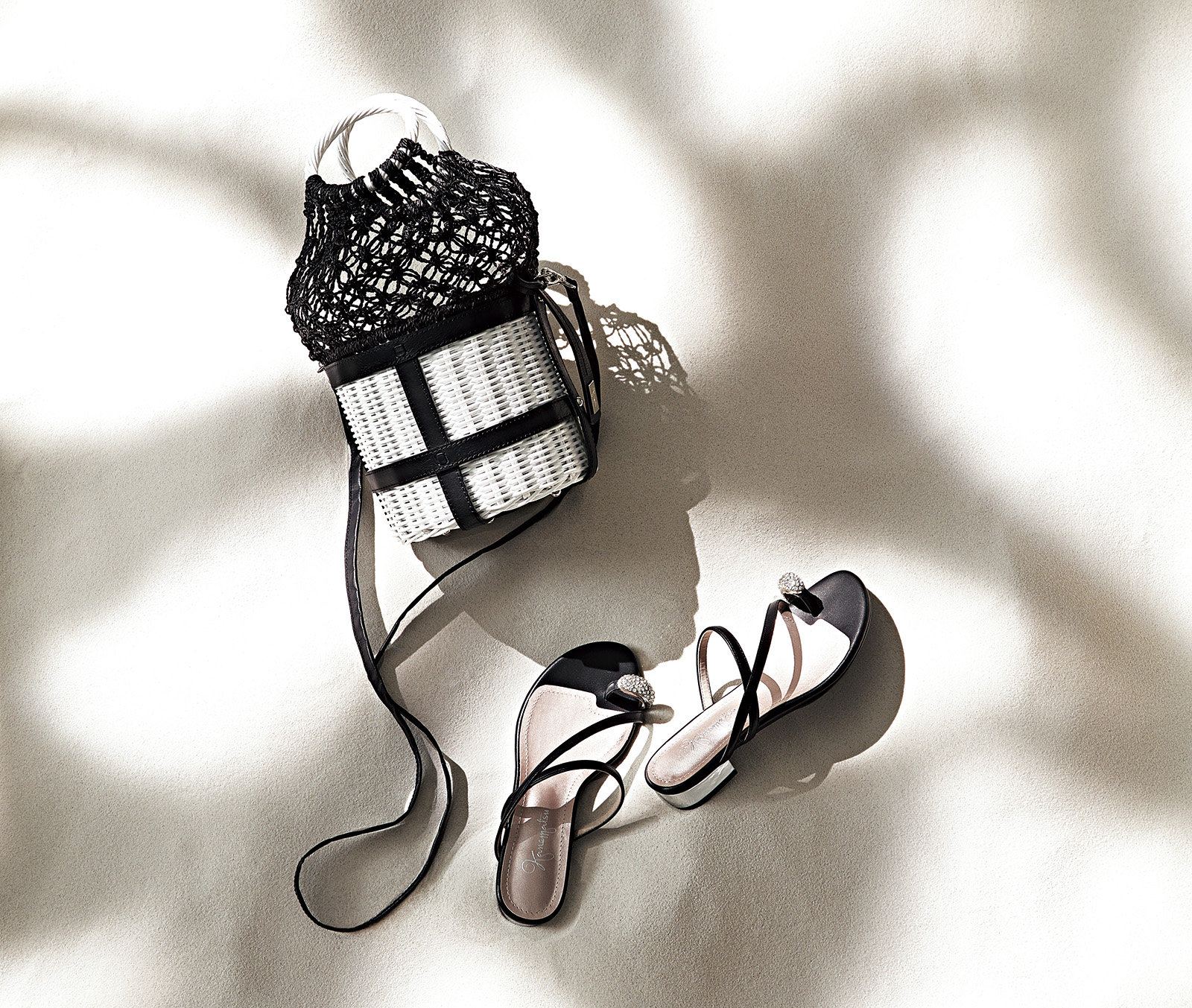 いくつあっても欲しくなるのがシンプルコーデを盛り上げてくれる夏小物! 銀座かねまつで見つけたのは、華やかでありつつ上品な雰囲気の〝黒〟が基調のバッグ&サンダル。