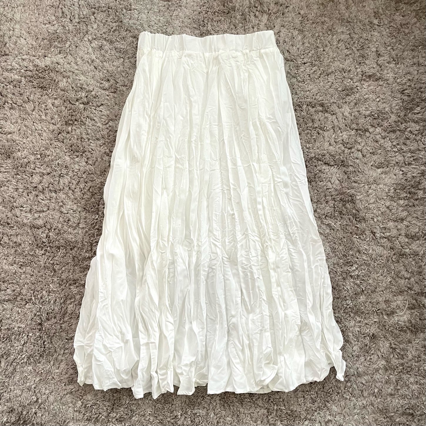 ボトムスは全般的に「シワになりやすいのが気になる」というレビューが多く見られたので、あえてシワ加工のスカートをチョイス。結果、買って正解のアイテムでした!ウエストゴムが少し安っぽいので、トップスをアウトして着るのがよさそう。裏地つきで透けは気になりません。普段は汚れに気を遣う白のボトムスも、この値段なら気軽に使えます。