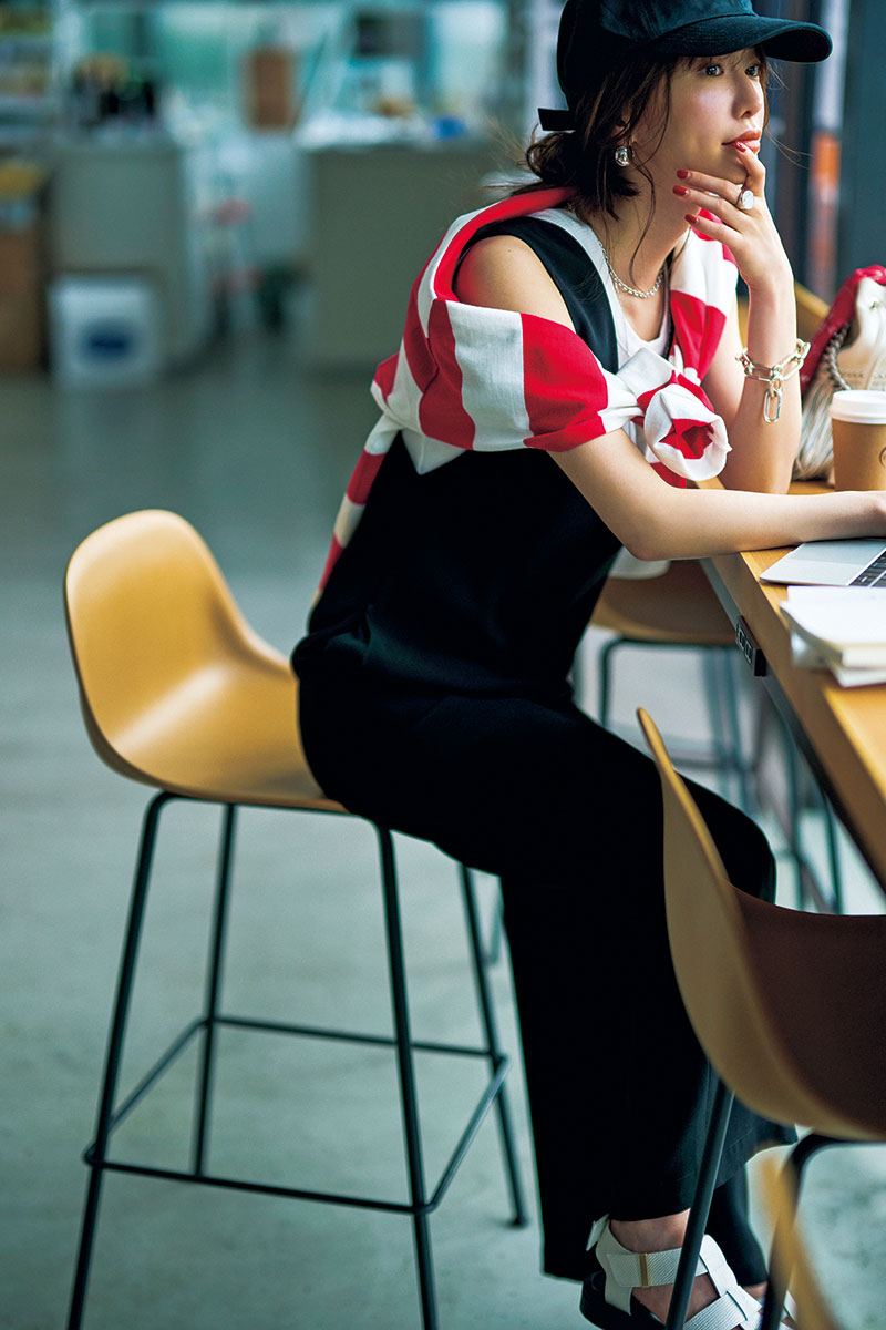 トップスの色・柄、差し色、帽子、ジュエリーなど上半身にポイントを。オンライン会議で画面に映る自分に自信が持てたら、他人ともいいコミュニケーションがとれると思う!オールインワン¥30,800(エストネーション/エストネーション)タンクトップ¥12,100(エー・ゴールド・イー/シチズンズ・オブ・ヒューマニティ)ボーダーカットソー¥19,800(THIRD MAGAZINE/THIRD MAGAZINE)キャップ¥7,700(ティッカ/アッシュプラスエリオトロープ)バッグに結んだスカーフ¥13,200(マニプリ)チェーンネックレス[40㎝]¥41,800コインネックレス[70㎝]¥26,400 ハウライトリング¥58,300(すべてマリハ)ピアス¥13,200(D.U.E/e.m.PRESS ROOM)ブレスレット¥165,000(e.m./e.m.青山店)グルカサンダル¥17,600(ル タロン グリーズ/ル タロン グリーズ ルミネ新宿店)バッグ¥156,200(J&Mデヴィッドソン/J&M デヴィッドソン青山店)
