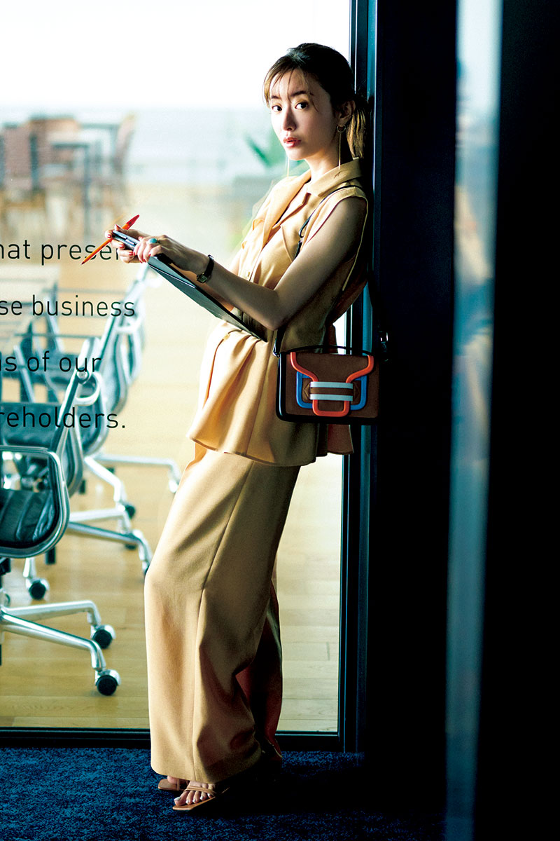 ベストのセットアップはきちんとした印象もありつつ、トレンド感もばっちり。自分の気持ちは引き締まるのに、気合いが入りすぎて見えないのもいいですね。ベスト¥14,300パンツ¥15,400(ともにパブリック トウキョウ/パブリック トウキョウ 神宮前店)ピアス[右耳/15㎝]¥71,500 ピアス[左耳/10㎝]¥60,500ラリマーリング¥63,800(すべてマリハ)時計¥23,100(デミルクス ビームス/ビームス ハウス 丸の内)サンダル¥125,400バッグ¥111,100(ともにピエール アルディ/ピエール アルディ 東京)