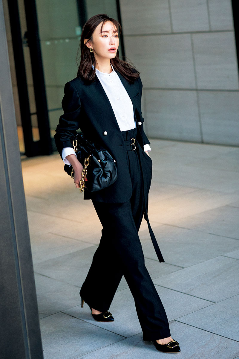 仕事に集中したい週のラストは、可愛らしい要素をあえて封印。凛としたかっこよさと、ディテールに女らしさの光るコーデで〝デキる女〟風にキメてみたい。