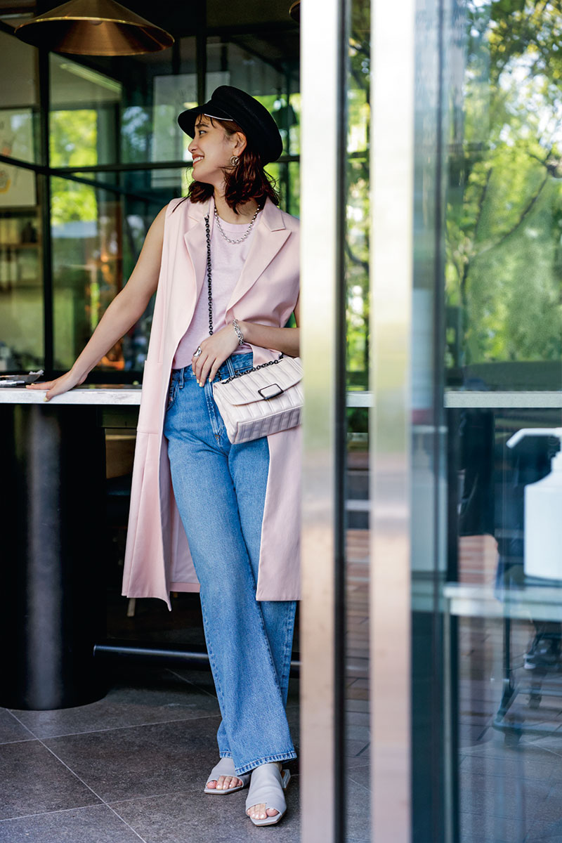 デニム¥31,900(ディーゼル/ディーゼル ジャパン)サンダル¥33,000(ファビオ ルスコーニ/ファビオ ルスコーニ ルミネ有楽町店)ジレ¥60,500(ANAYI)Tシャツ¥6,600(THIRD MAGAZINE/THIRD MAGAZINE)帽子¥29,700(エントワフェイン/メゾン イエナ)ネックレス¥18,150 ブレスレット¥14,300(ともにフィリップ オーディベール/アルアバイル)ピアス[片耳価格]各¥22,000(e.m./e.m.青山店)リング¥16,500(ウノアエレシルバーコレクション/ウノアエレ ジャパン)バッグ¥96,800(ロンシャン/ロンシャン・ジャパン)