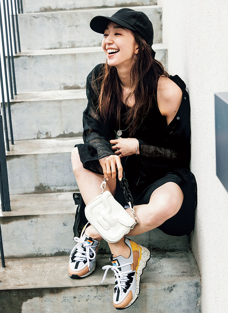 キャップやスニーカーなどアイコニックなスポーティ要素をちりばめたヘルシーカジュアル。シアーなシャツとチラ見せの肩、そしてトレンドのショーパンから伸びる脚…肌をのぞかせても黒なら大人。真っ白なちびバッグが夏らしい透け感要素になってくれます。シャツ¥25,300(エリオポール/エリオポール代官山)タンクトップ¥7,150(ハイク/ボウルズ)ショートパンツ¥18,480(ELENDEEK)バッグ¥111,100スニーカー¥86,900(ともにピエール アルディ/ピエール アルディ東京)キャップ¥16,500(エントワフェイン)ピアス¥30,800ネックレス¥26,400 バングル¥63,800(すべてマリハ)