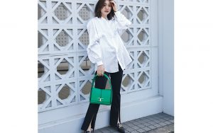 シャツ¥66,000(ブリエンヌ/ユナイテッドアローズ 原宿本店)パンツ¥22,000(LE PHIL/LE PHIL NEWoMan新宿店)バッグ¥267,300パンプス¥113,300(ともにトッズ/トッズ・ジャパン)ピアス¥16,500(アンセム フォー ザ センセズ/アマン)バングル¥4,400(アビステ)リング¥25,300(メラキ/フラッパーズ)