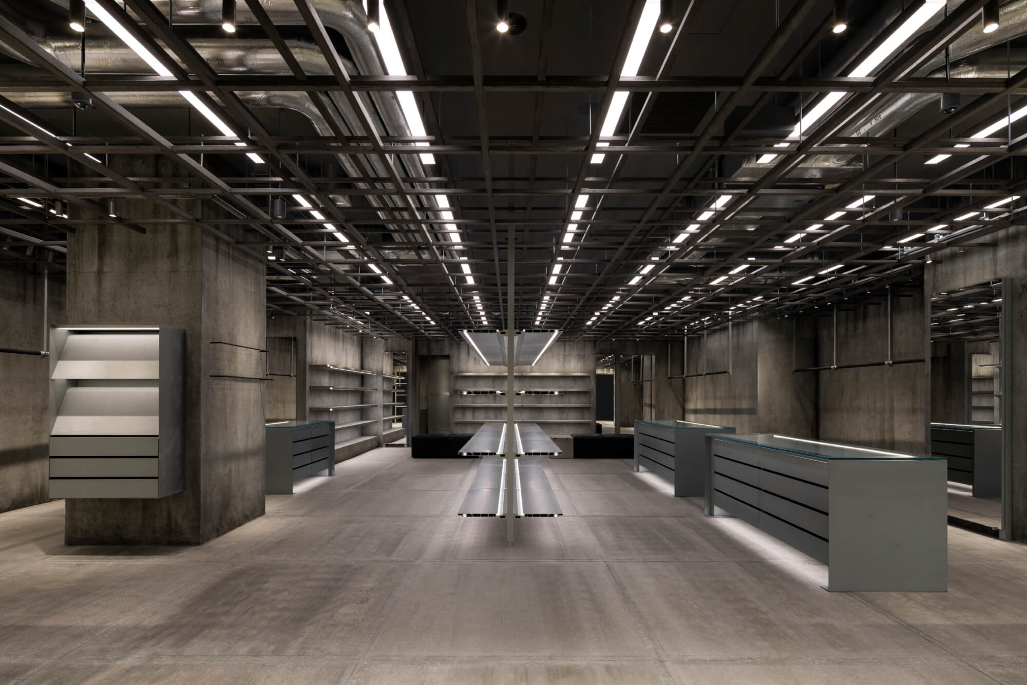 “Raw Architecture”とは構造物の環境や内部の仕組み、蓄積された過程に反応し、表面を意図的に洗練されないままにする建築のこと。このコンセプトにより、本質的に、厳格なサステナビリティの必要条件を満たしながらより少ない未加工原料を消費する、ユニークで、場所特有のスペースを作り出すことが可能になります。 ストアのオープンエントランスとメタルで縁取ったウィンドーはエッジが粗いコンクリートブロックで覆われ、片側にはフロントリットのBalenciagaロゴ、もう片側にはアップデートされたBalenciagaのメディアを周囲のホールに表示するデジタルスクリーンが施されています。空間全体を通して、古つやと自然に生じる未加工の表面が仕上げとして取り入れられ、空間を発展状態のままに留めています。
