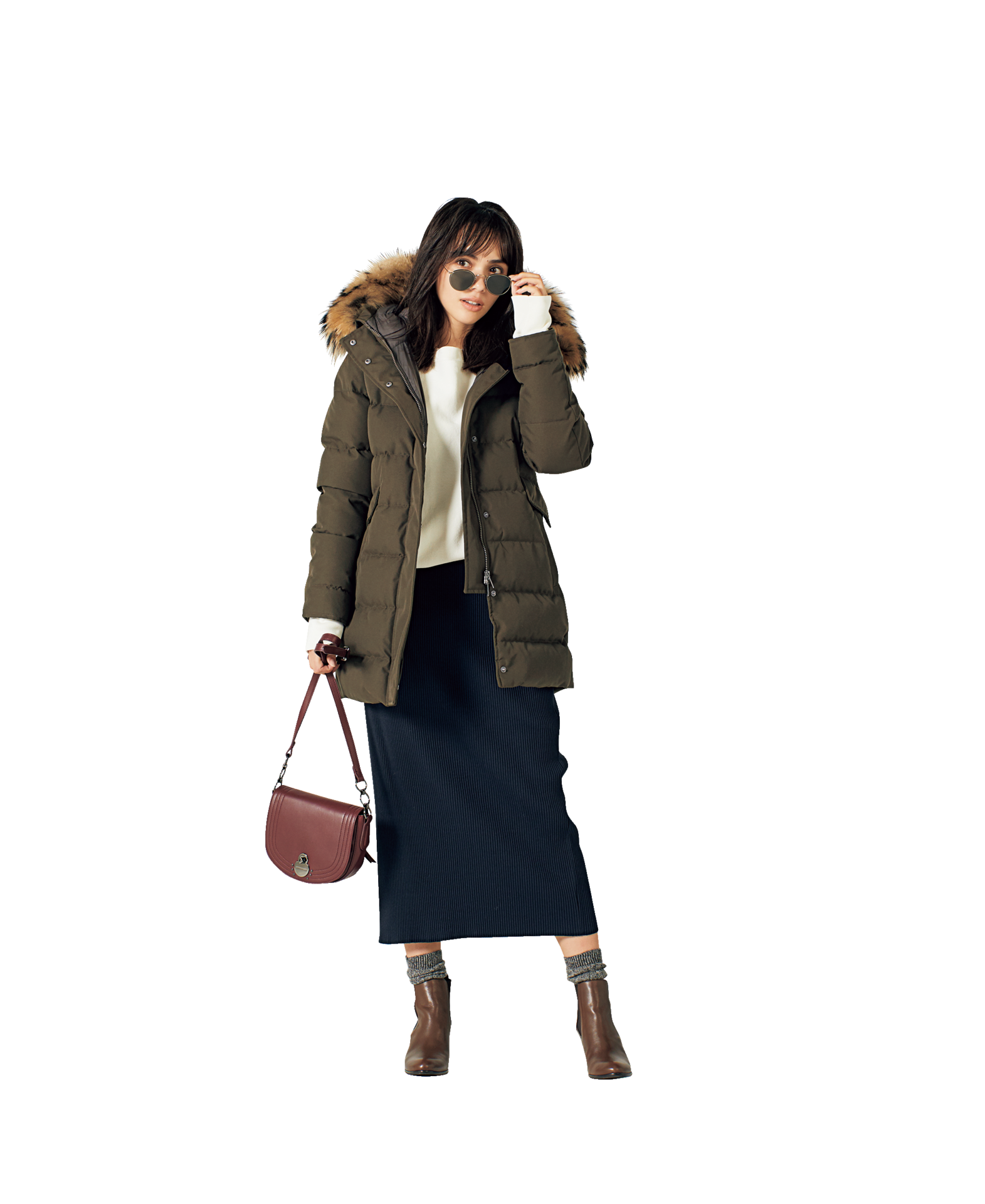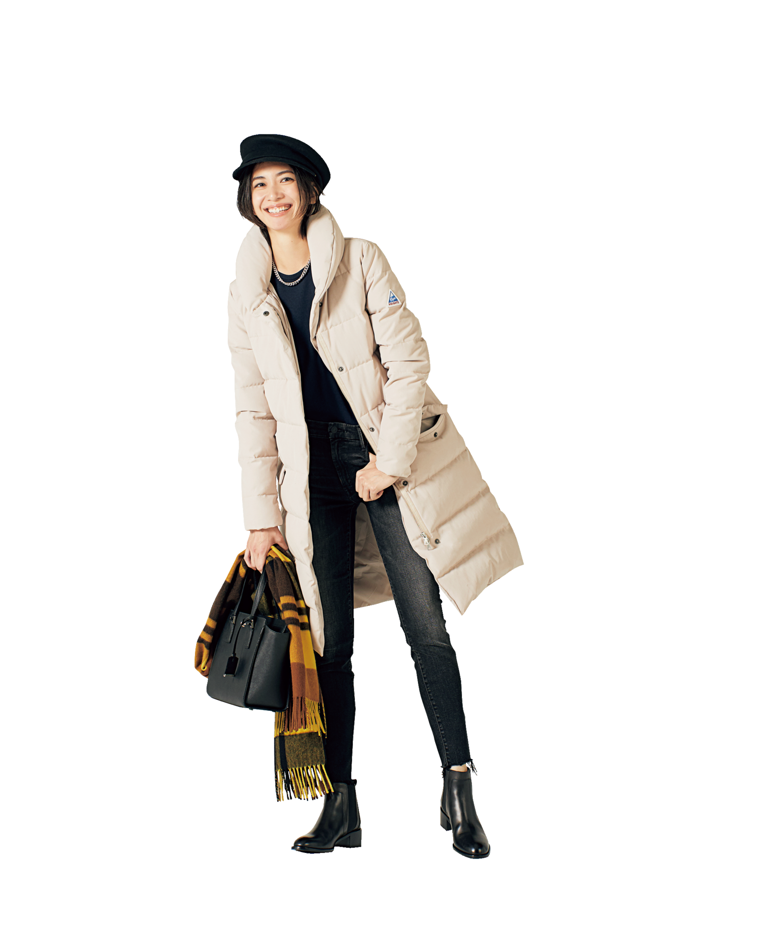 体にキレイに沿う細身ラインとシェイプされたウエストが細見え効果抜群! ニュアンスのある素材の柔らかさも女性らしさをアップしてくれそう。ダウンコート「LAVIANA」¥128,000(タトラス/タトラス ジャパン)ニット¥7,990(UNIQLO)デニムパンツ¥29,000(エージー/エージー ジャパン)バッグ¥75,000(ロンシャン/ロンシャン・ジャパン)パンプス¥30,000(デプレ ファビオルスコーニ/DES PRÉS 丸の内店)ピアス¥3,500(アビステ)