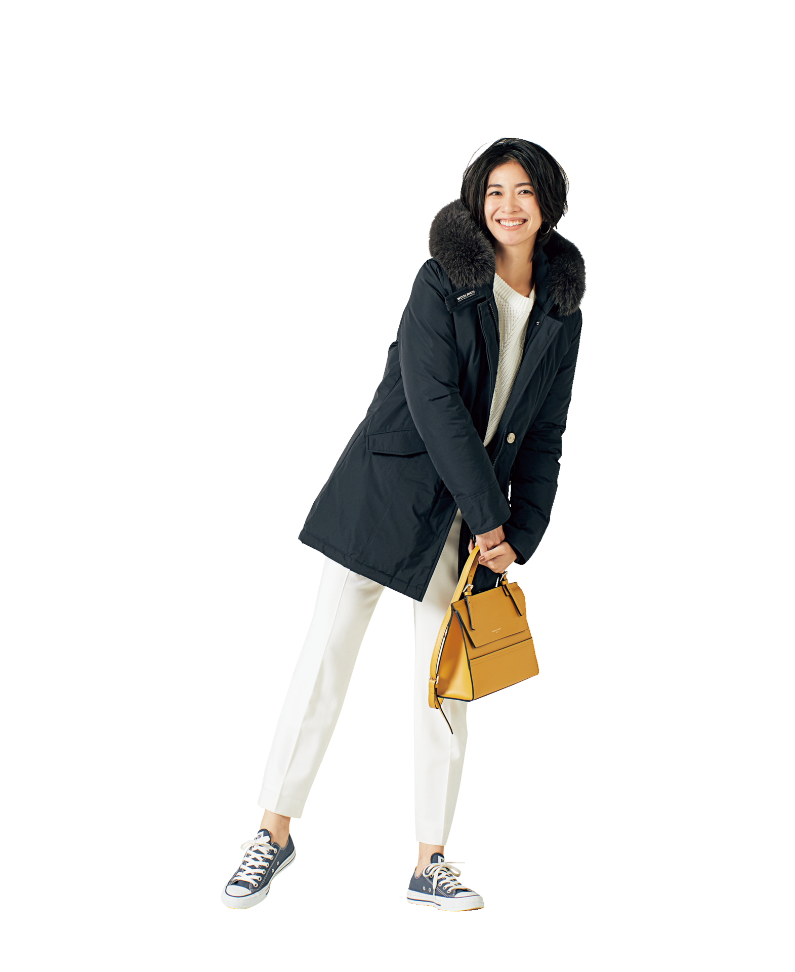 ネイビーならより締まって細見え! オールホワイトコーデを引き締めてくれます。ダウンコート「W’S LUXURY ARCTIC PARKA FOX」¥123,000(ウールリッチ/ウールリッチ カスタマーサービス)ニット¥26,000(デミリー/サザビーリーグ)パンツ¥29,000(Theory luxe)バッグ¥22,000(ペレッテリア ベネタ/ビームス ライツ 渋谷)スニーカー¥5,800(コンバース/コンバースインフォメーションセンター)