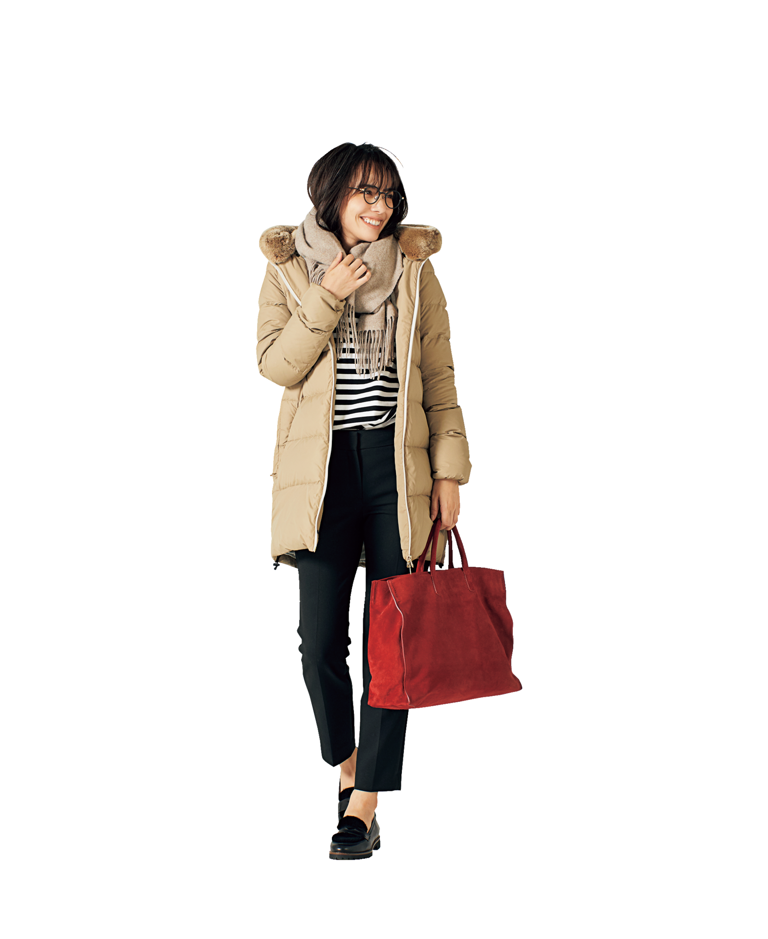 フードのゴージャスなラビットファー×上質なマットナイロンの組合せでスマートに。ダウンコート「carysdue」¥138,000(デュベティカ/F.E.N.)カットソー¥10,000(アニエスベー)パン¥20,000(Theory)バッグ¥59,000(ペリーコ/アマン)ローファー¥21,000(CORSO ROMA9/ナノ・ユニバース カスタマーサービス)ストール¥3,695(無印良品/無印良品 池袋西武)メガネ¥50,000(アイヴァン 7285/アイヴァン 7285 トウキョウ)