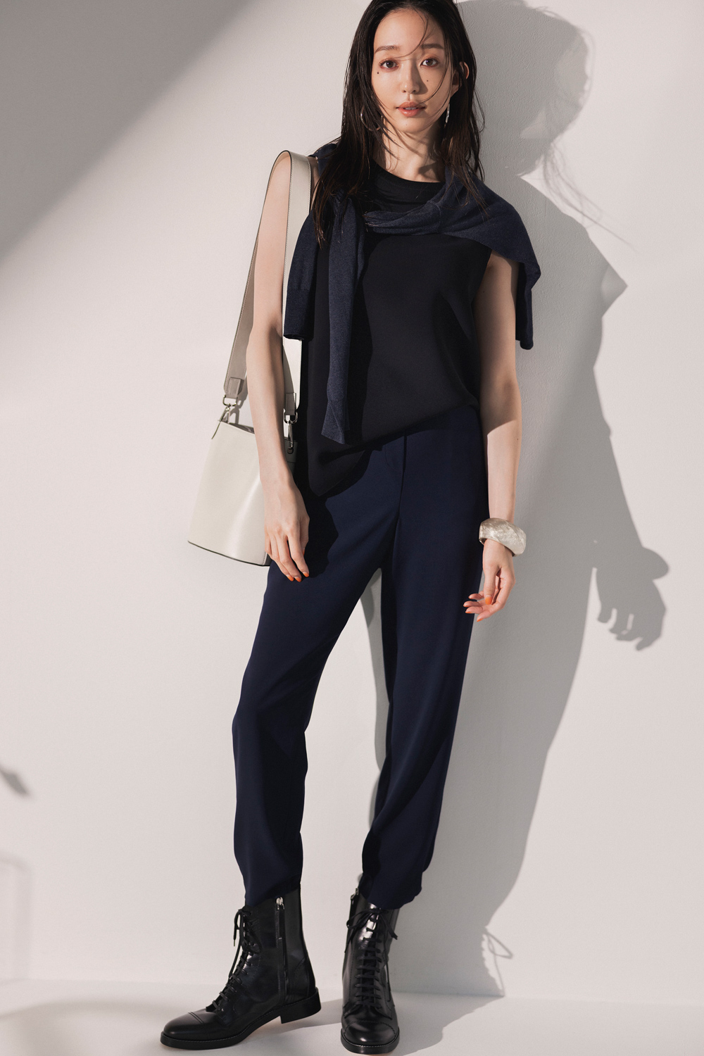 スポーティなエッセンスを加えるジョガーパンツの一点投入で、着慣れたカジュアルが都会的に進化。ジョガーパンツは後ろの裾のみゴム仕様のカジュアル感をセーブするデザインで、大人も挑戦しやすいのが魅力。落ち感のある“Powder Crepe”素材と脚のラインを拾わないテーパードシルエットで、リラクシーなのにちゃんとキレイめ! ブーツなどで足元を変えれば、夏はもちろん秋まで大活躍の予感。
