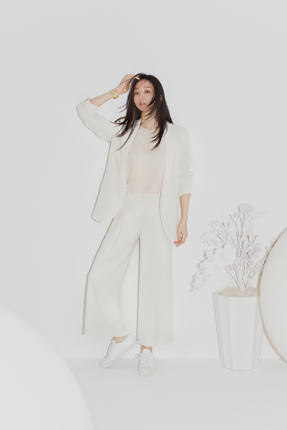 ジャケットセットアップを主役に、ALL白でまとめた着こなし。爽やかであると同時に、大人ならではの聡明さを印象付けます。ジャケットとパンツにはTheoryのベストセラー素材を進化させた、“Admiral Stripe”を使用。織組織によるストライプ柄で、生地に凹凸があるのがポイント。肌に当たる面積が抑えられ、ドライな質感が汗ばむ季節にもぴったりです。ストライプが生むニュアンスのある素材感がフェミニンな一面もプラス。