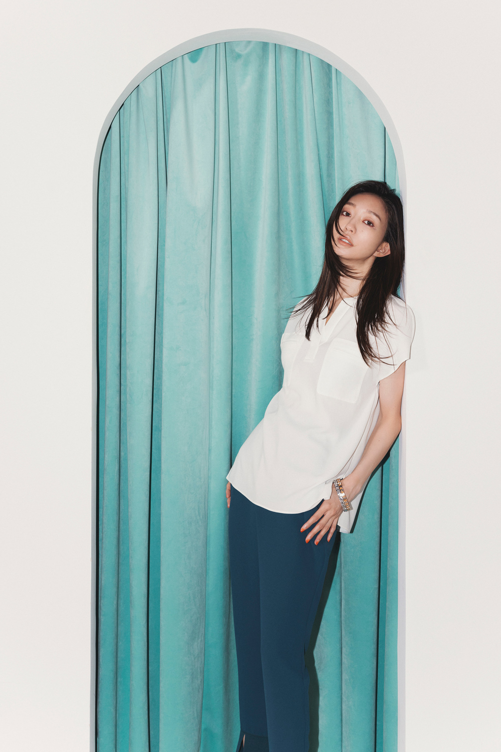 ジリジリと暑い真夏日こそ、クリーンな白ブラウスで作るそぎ落としたシンプルな装いで、身も心も軽やかに過ごしたい。とはいえ“ただのシンプル”で終わらせるのではなく、両胸のビッグポケットやデコルテをすっきり見せるスキッパーネックをさりげないアクセントに。ブラウスとパンツのワンツーコーデも、しっかりサマになるのが嬉しいところ。この夏は“Powder Crepe”素材を味方にして、気温や湿度の高い日も涼しく&スマートに!