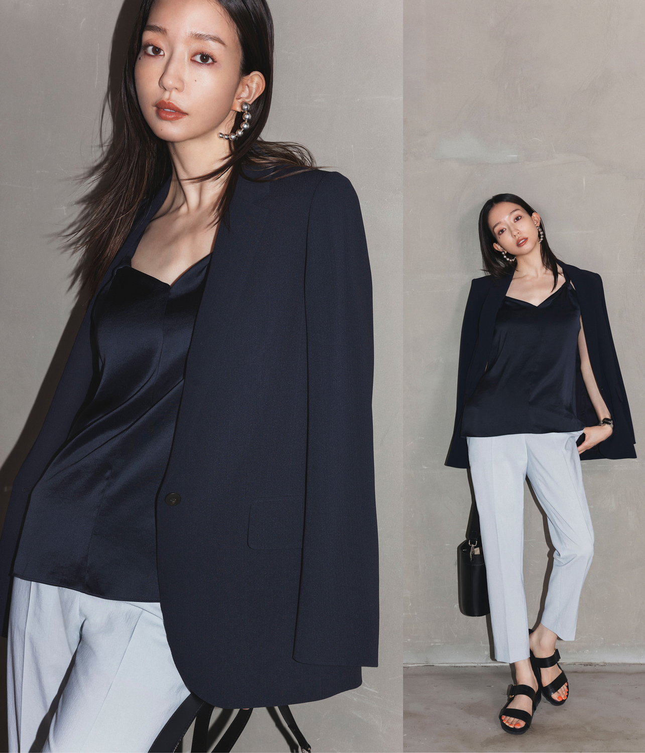 さらりと涼しい“Admiral Stripe”素材のジャケットは、肩の力を抜いて着られるオーバーシルエットが今の気分。ソフトな生地感と細めのラペルが、ジャケットスタイルをエレガントに導きます。インナーに仕込んだのは、美しい光沢を放つサテン地のキャミソール。品位のあるネイビーが大人の余裕を感じさせます。ボトムには清涼感を添えるアイスブルーのスリムパンツをセレクトして、全身涼やかな大人のお仕事コーデに!