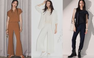 さらさらのドライタッチな肌当たりで、昨年大ヒットした“Powder Crepe”素材。今季登場する新色「サハラ」は、肌にやさしくなじむヘルシーなブラウン系カラー。セットアップで取り入れれば、小粋なワントーンコーデが簡単に完成します。フレアシルエットのパンツは、足元がぺたんこでもスタイルよく着られる優秀設計! 前ウエストにはギャザーを入れずフラットに仕上げることで、クリーンな雰囲気に。