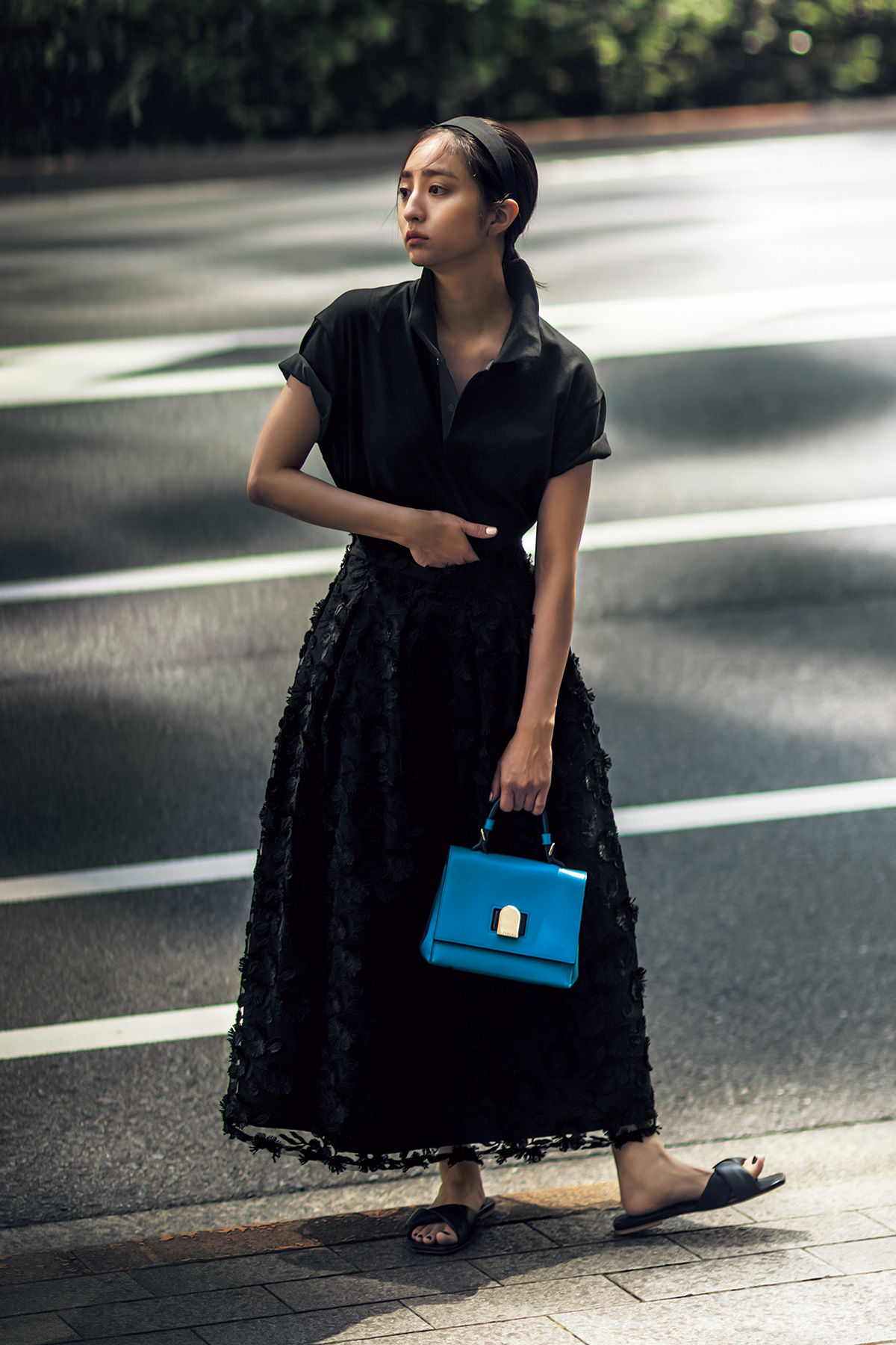 無造作に開けたボタンから覗くデコルテが女っぽい。ビッグシルエットだからこそ、袖をまくったり、ひと手間で着こなしに差がつきます。ポロシャツ¥1,990(ユニクロ)スカート¥48,400(ツル バイ マリコ オイカワ)バッグ¥71,500(フルラ/フルラ ジャパン)ヘッドアクセ¥7,700(IRIS47/フーブス)サンダル[予定価格]¥20,900(アイリス&インク/THE OUTNET)
