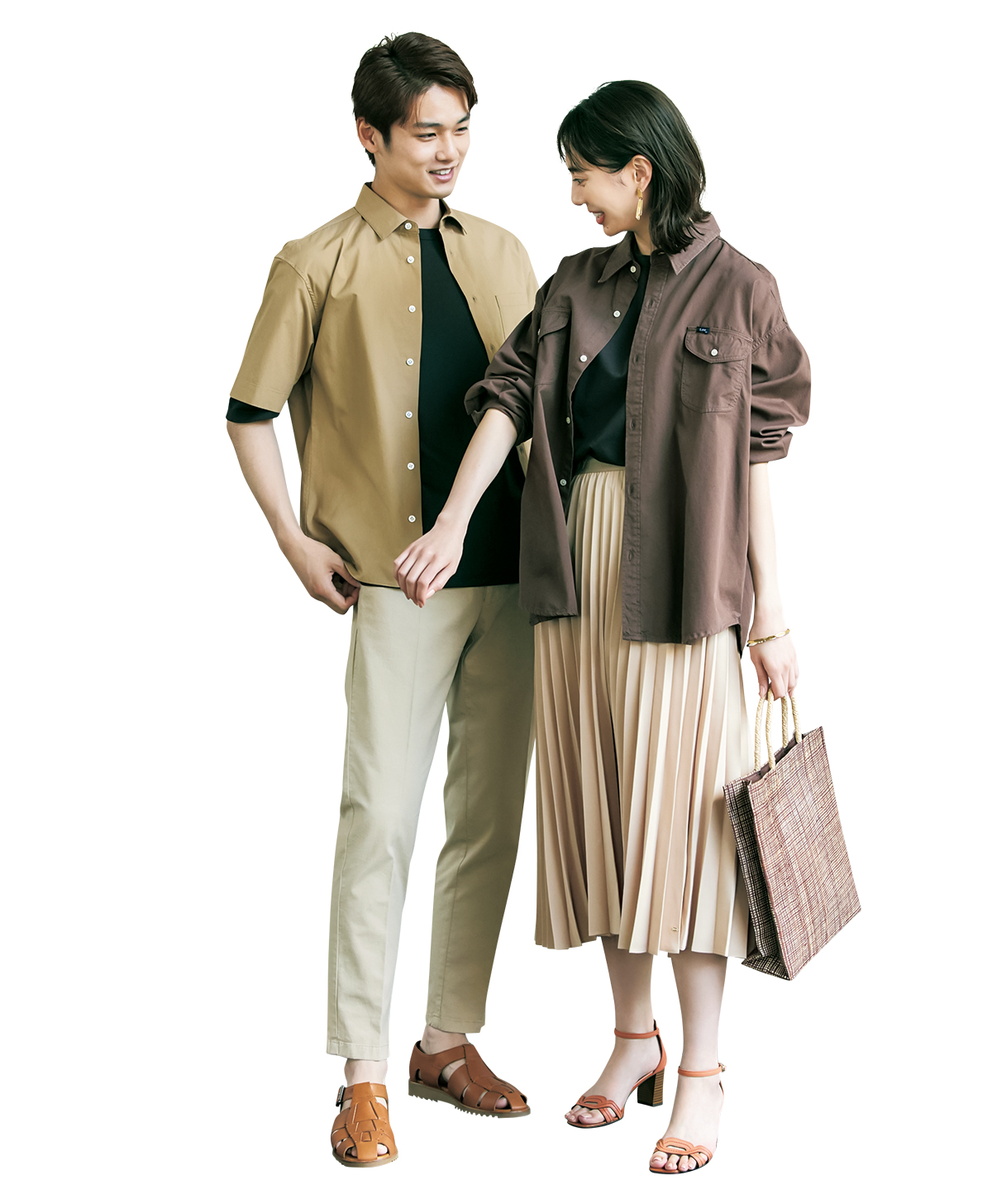 ブラウンとベージュを組合せると、茶系の濃淡グラデーションコーデが完成します。レイヤードや表情のあるプリーツスカートで、のっぺり見えないようにメリハリを出して。【女性】シャツ¥8,250(Lee/エドウイン・カスタマーサービス)カットソー¥8,800(カオス/カオス表参道)プリーツスカート¥18,700(トミー ヒルフィガー/トミー ヒルフィガー カスタマーサービス)バッグ¥6,490(ル タロン/ル タロン プリュ 有楽町マルイ店)サンダル¥15,950(ダイアナ/ダイアナ 銀座本店)ピアス¥19,580(ソコ/ZUTTOHOLIC)ブレスレット2本セット¥4,860(アビステ)【男性】シャツ¥12,100(アウール/アウール阪急メンズ大阪)Tシャツ¥8,800(フューズ/フューズ福岡西通り店)パンツ¥46,200(ラルディーニ/トヨダトレーディング プレスルーム)サンダル¥39,600(パラブーツ/パラブーツ青山)