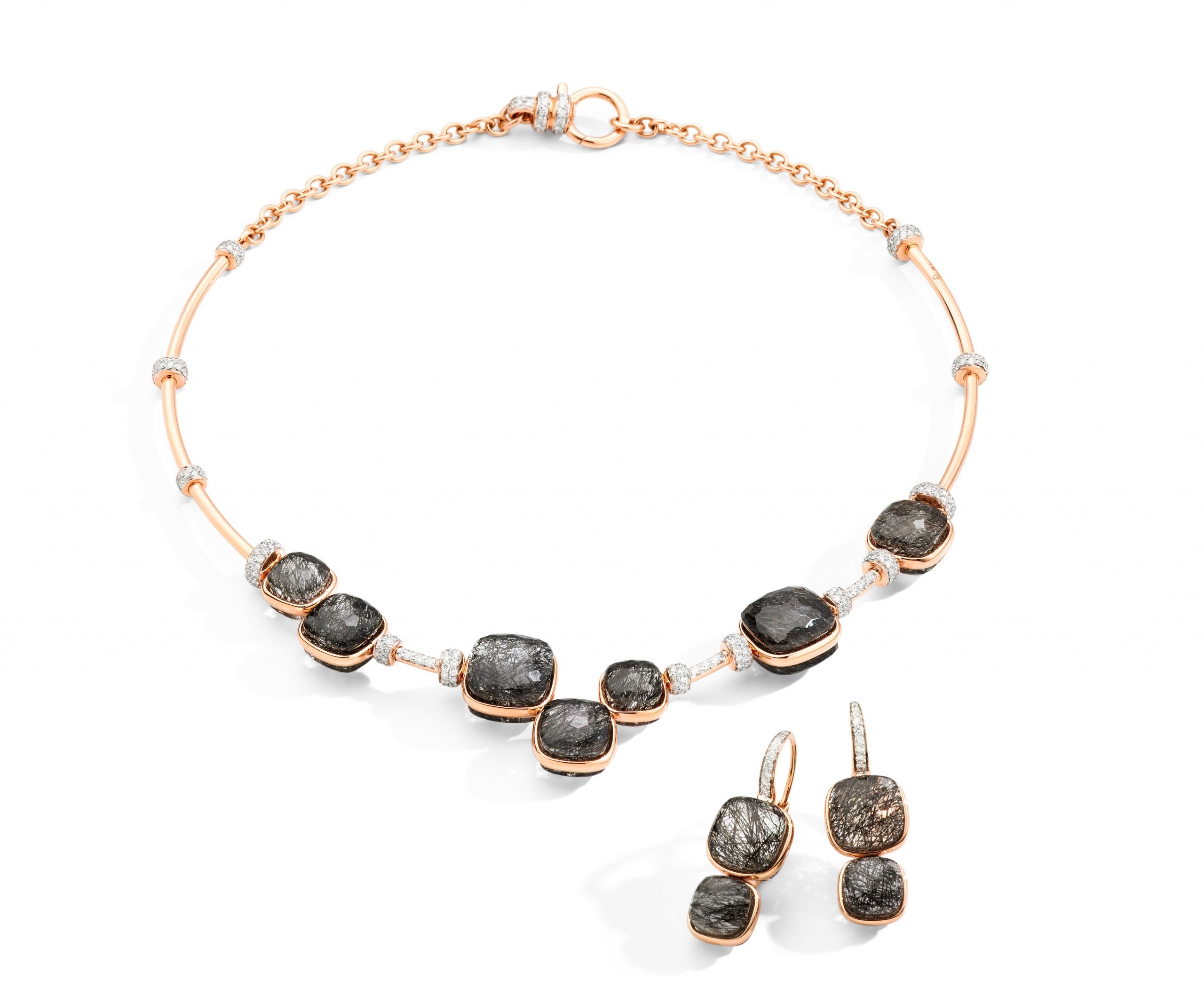 イタリア語で「ありのまま/裸の」を意味する「ヌード」。今回発表のネックレスやイヤリングに採用されているクレシドラカットは、2 つのストーンをシームレスにつなぎ、中央をゴールドのバンドで囲んだもので、イタリア語で「砂時計」を意味する名がつけられています。この特殊なカットにより、新鮮なカラーのニュアンスや透明感や不透明さも含めた魅惑的なコンビネーションに無限の可能性を広げます。両面にほどこされたカットにより、ストーンが直接肌に触れることでピース自体をより身近に感じることができます。ぜひ会場で実際に手に取ってみて。