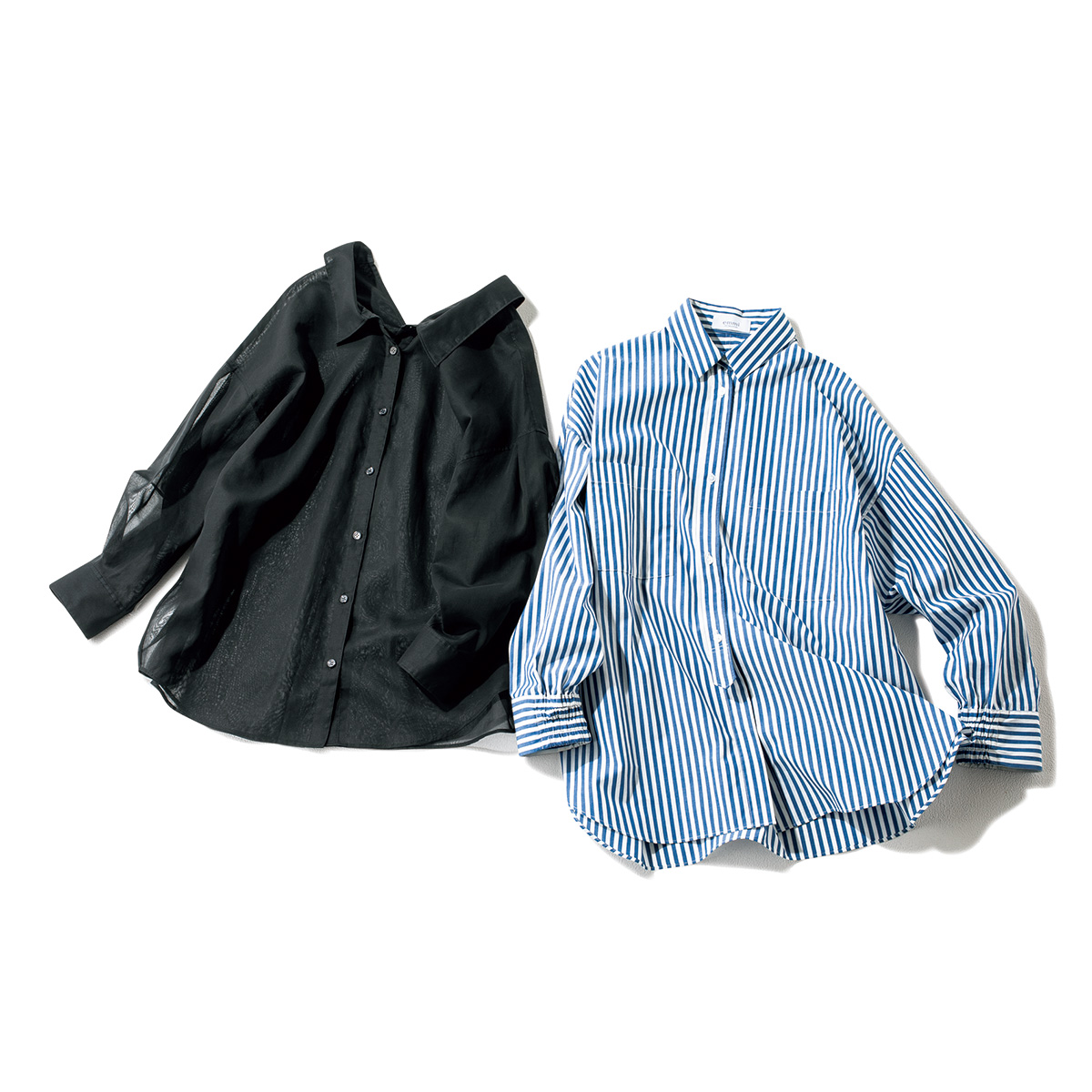 【右】メンズライクなストライプシャツを無造作に羽織る、決めすぎないゆとりが今っぽい。シャツ¥16,940(エミ アトリエ/エミ ニュウマン新宿店)【左】大人っぽく着られるシアーな黒シャツなら、オシャレしたいお出かけやデートにもお役立ち。バックのV開きが女っぽさをあと押しします。シャツ¥17,600(マイストラーダ)
