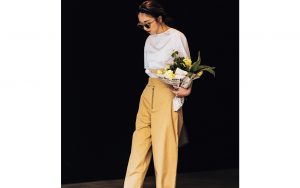 チノパン¥25,300(アストラット/アストラット 新宿店)ブラウス¥22,000(ウィム ガゼット/ウィム ガゼット ルミネ新宿店)バッグ¥77,000(J&M デヴィッドソン/J&M デヴィッドソン 青山店)シューズ¥86,900(フランチェスコ ルッソ/ロンハーマン)ヘッドアクセ¥7,700(ター/エリオポール 代官山)めがね¥36,300サングラスクリップ¥14,300(ともにモスコット/モスコット トウキョウ)