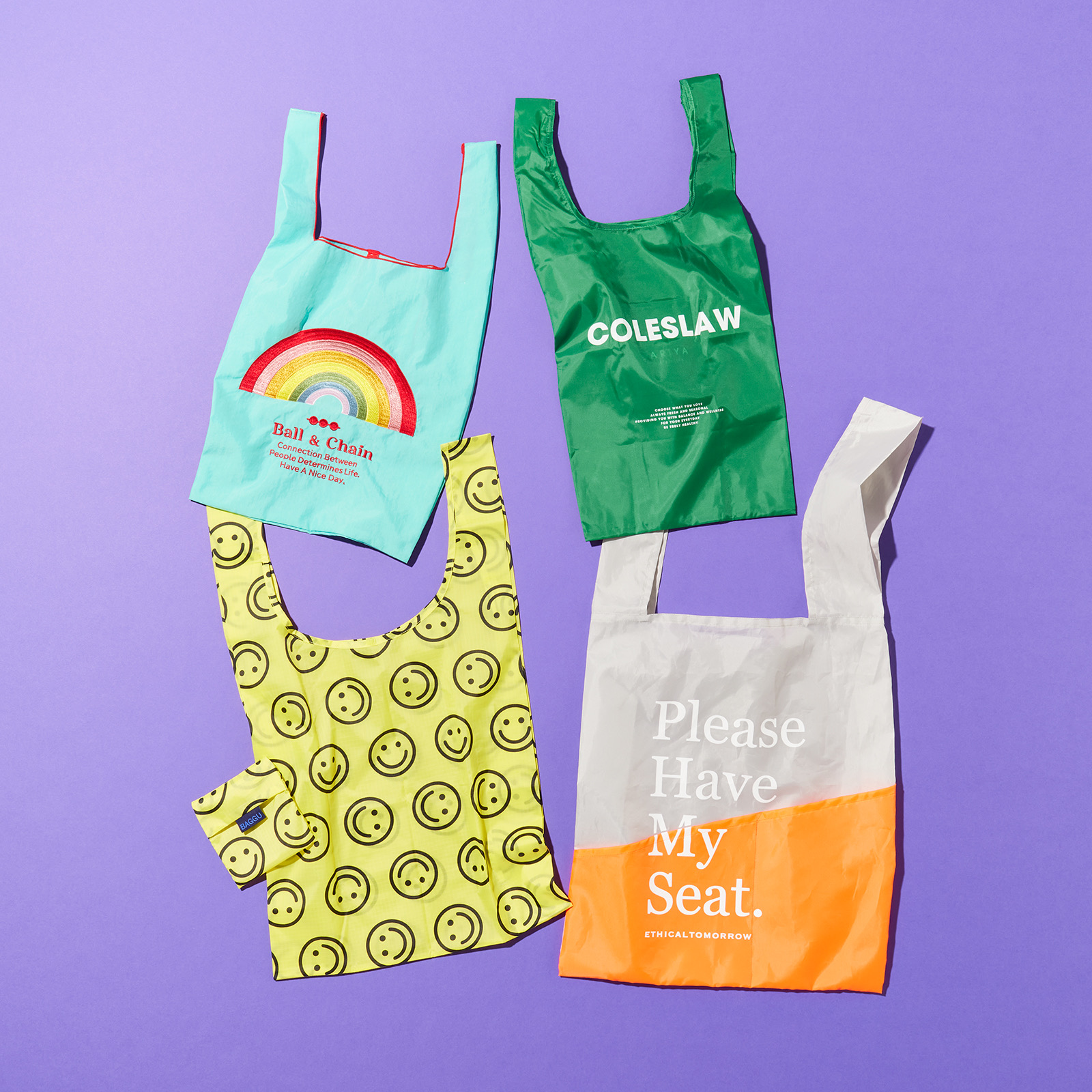 カリフォルニアで生まれたバッグブランド。海外らしい、色彩豊かなデザインが豊富に揃います。遊び心のあるスマイリーの総柄は、エコバッグながら存在感たっぷり。付属のミニポーチに入れて持ち運べるほか、持ち手が長めに作られていて肩がけしやすいのがポイント。バッグ¥1,980〈H64×W39×D15〉(BAGGU)