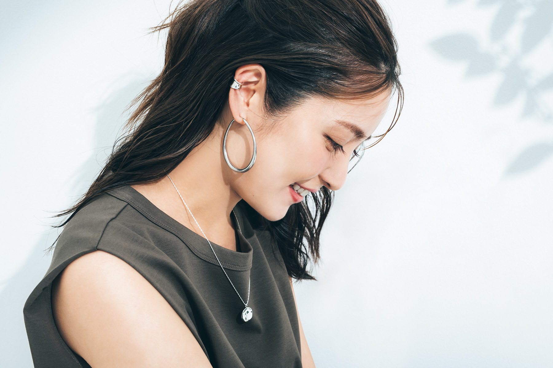 しっかり存在感のあるフープを主役に片耳にはイヤカフでアクセントを。立体的でアクティブな顔まわりに仕上げることで、夏のシンプルコーデに賑やかさをプラス。