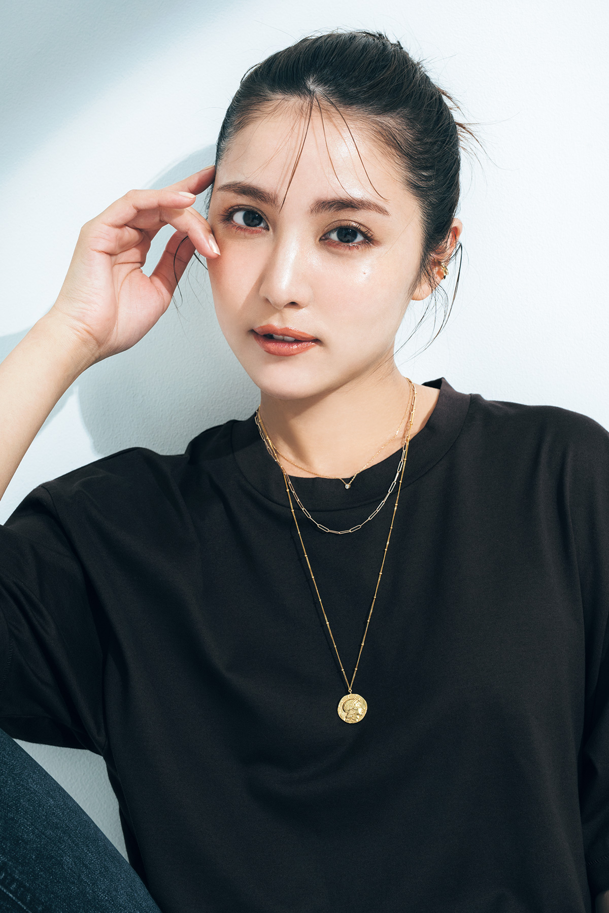 目を引くコインネックレスでシンプルな無地Tの胸元を飾ればこの夏のitスタイルが完成。長さとデザインの異なるネックレスを重ね着けて、広範囲を華やげて。