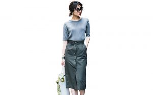 7月19日(火)、連休明けは「カーキのペンシルスカート」でキリッと気持ちを引き締めて。スカートと同系色のリブニットを合わせれば、コンサバすぎず今っぽく着こなせます。足元は、ひとクセ効いたスクエアトゥのカラーパンプスで差し色を。