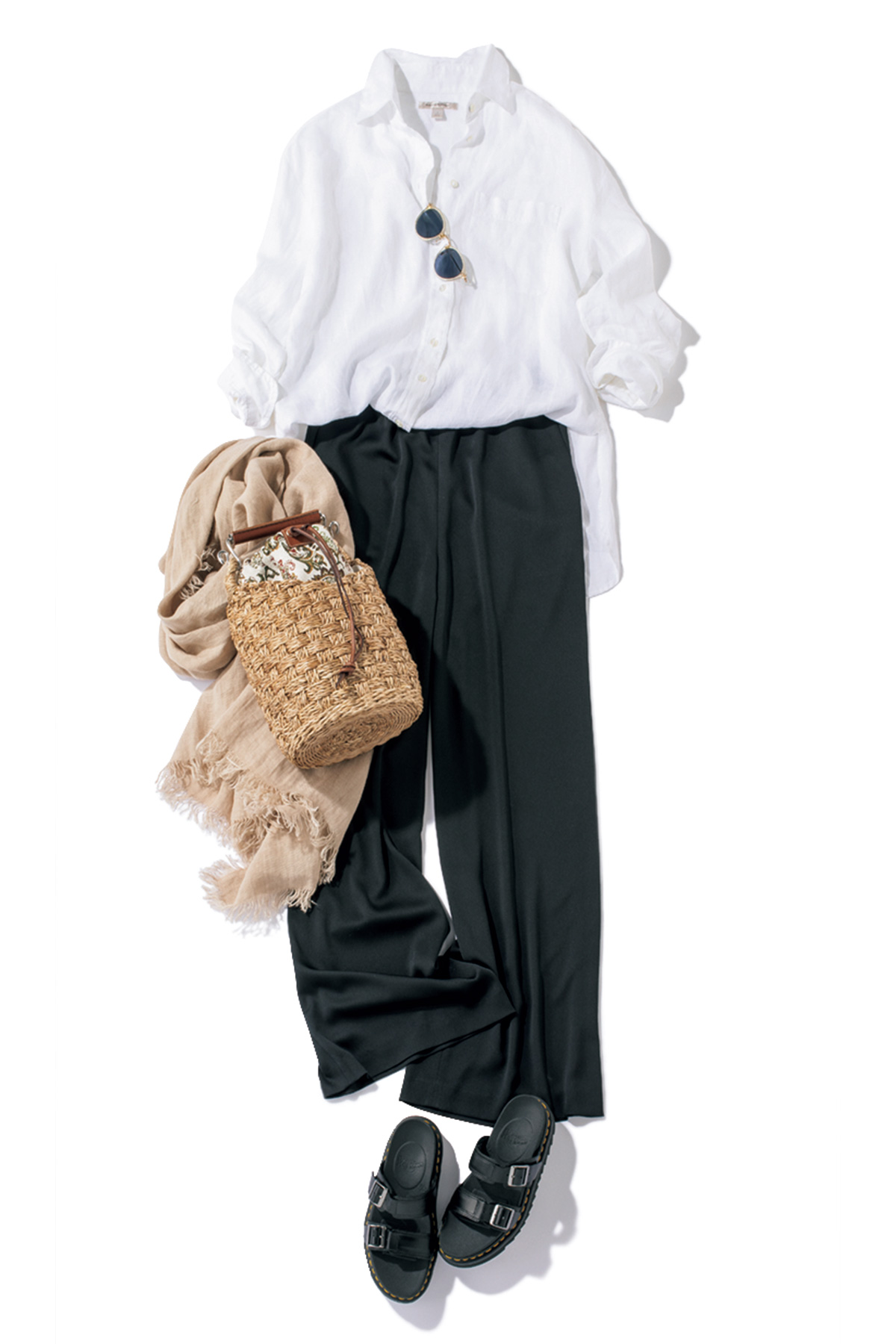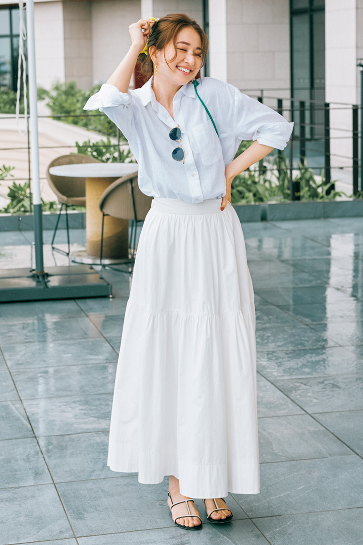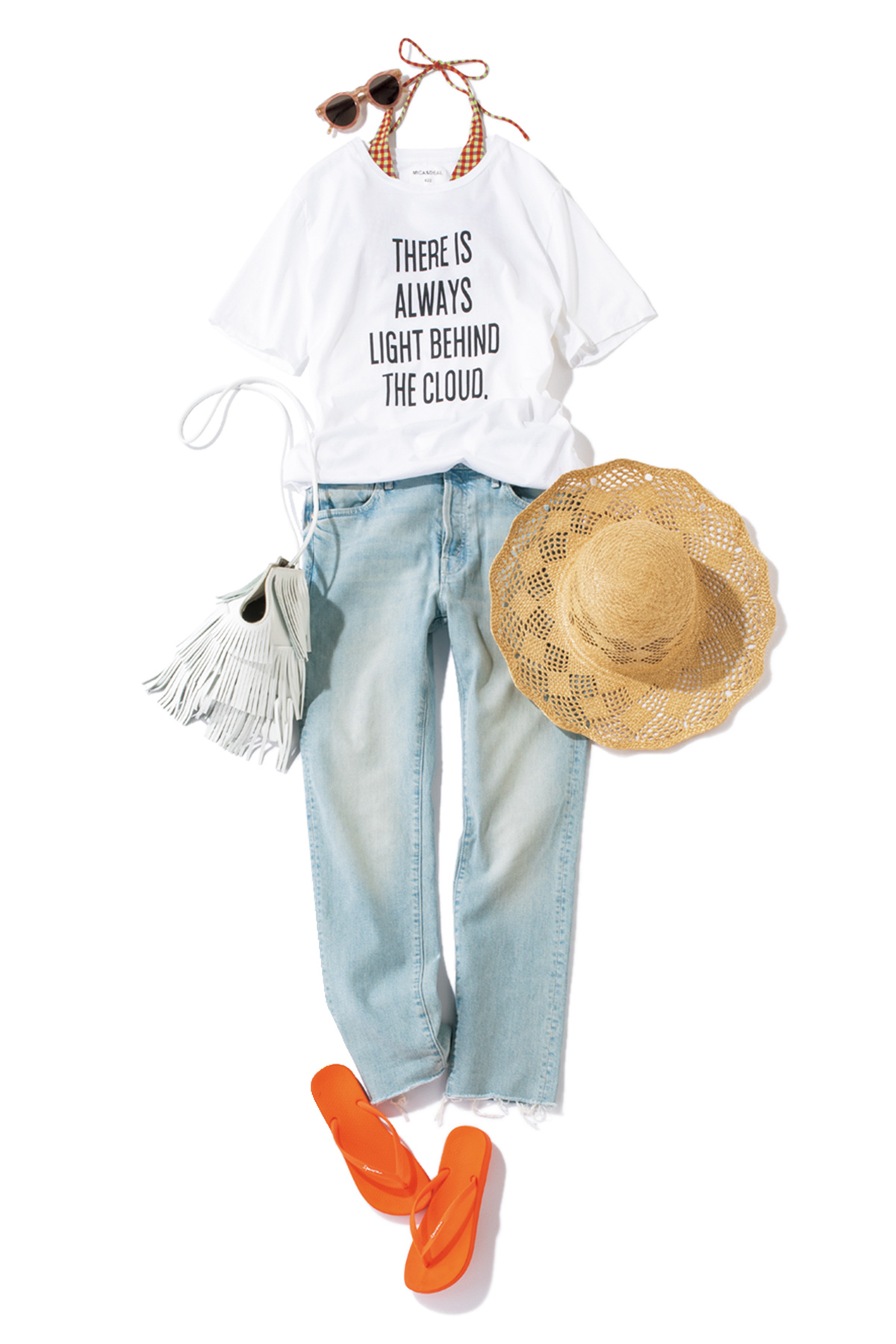 ただゴムで結ぶのも抜け感があっていいけど、スカーフをプラスすると気分もぐんと高まるよね。元同僚に沖縄で出会ったユウスケくんとの話をしたら、「うまくいったとしてどうするの?しかは東京戻るじゃん??」って。たしかに。バッグ¥19,800(ノマディス)サンダル¥38,500(イル サンダロ オブ カプリ/アマン)スカーフ¥9,900(アルアバイル)サングラス¥41,800(アイヴァン/アイヴァン 東京ギャラリー)ピアス¥8,800(アビステ)