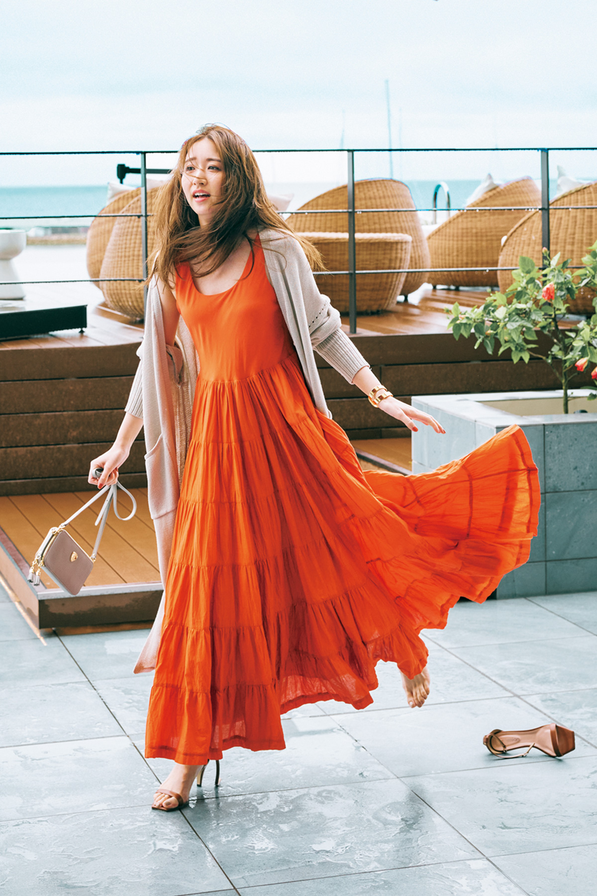 しかも待ち合わせ時間よりも10分早く「もう着いた」と連絡が。急いで部屋を出たら、ヒールサンダルのストラップをしっかり留めていなくて、サンダルが脱げた。急かされるの、苦手~(涙)。でもオレンジの映えるワンピースでばっちりなはず。急いでいてもサマになる洋服は、旅先にも持ってくるべきだね!バッグ¥34,100(アタオ/スタジオアタオ)サンダル¥8,690(マミアン/マミアン カスタマーサポート)バングル¥4,400(アビステ)