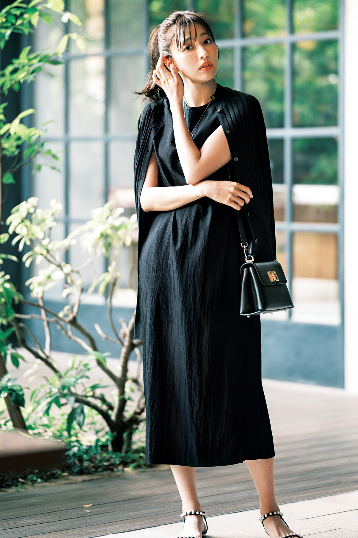 靴やシューズをレディな雰囲気でまとめて大人らしい甘さをひとさじ。ワンピース¥19,910(アンクレイヴ ホワイト/オンワード樫山)カーディガン¥35,200(スローン)バッグ¥66,000(FURLA/FURLA JAPAN)サンダル¥24,200(ツル バイマリコ オイカワ)ロングネックレス¥37,400(ともにマリハ)