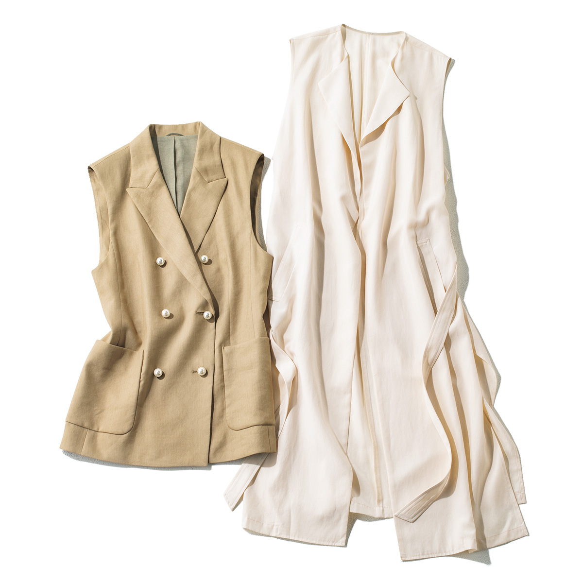 かしこまりすぎることなくきちんと感を出せるジレはワンピの羽織りとしても使えます。Iラインシルエットが体型を整え、シュッとしたバランスが手に入る!【右】ロングカーデ感覚で着こなせる、落ち感のキレイなリネン混ジレ。優しいアイボリーが女らしい表情を作ります。ジレ¥24,200(Stola.)【左】アクセントになる華やかなパールボタンとリッチなベージュが、大人にちょうどいい甘さを叶える1枚。ジレ¥49,500(ANAYI)
